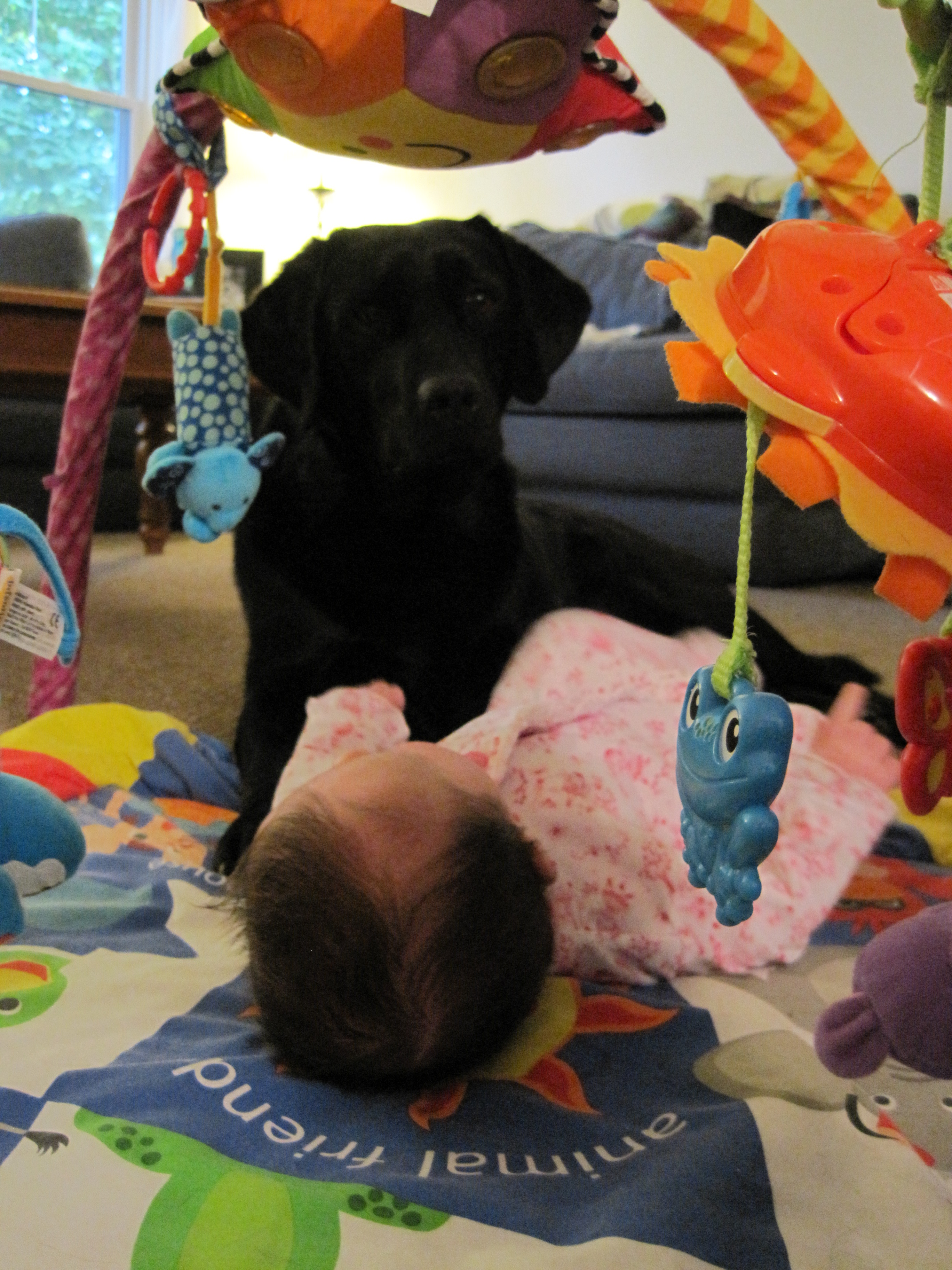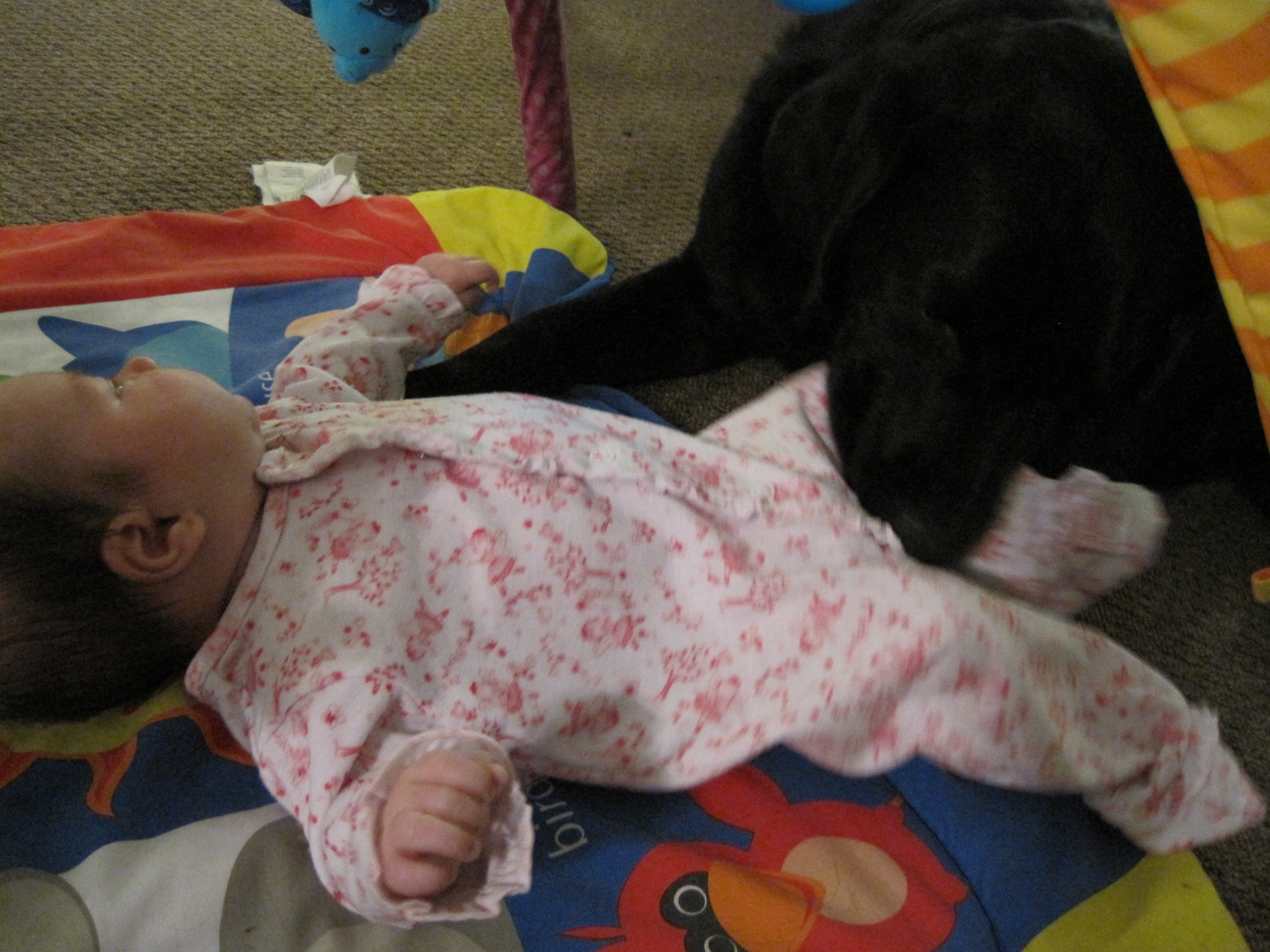 I couldn’t decide on a caption for this one. It could be “Izzie helps us decide if Margeaux needs a diaper change” or “Izzie gooses even babies.”