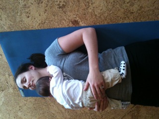 Miss M and I have been enjoying weekly Mom & Baby Yoga since she was about 7 weeks old. It was great in the beginning but it gets better every week, as she becomes more and more aware of what’s going on around her and smiles more and more. This week she fell asleep just in time for savasana.