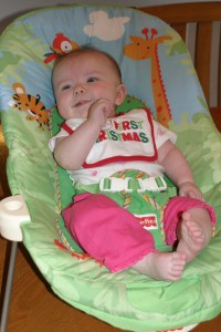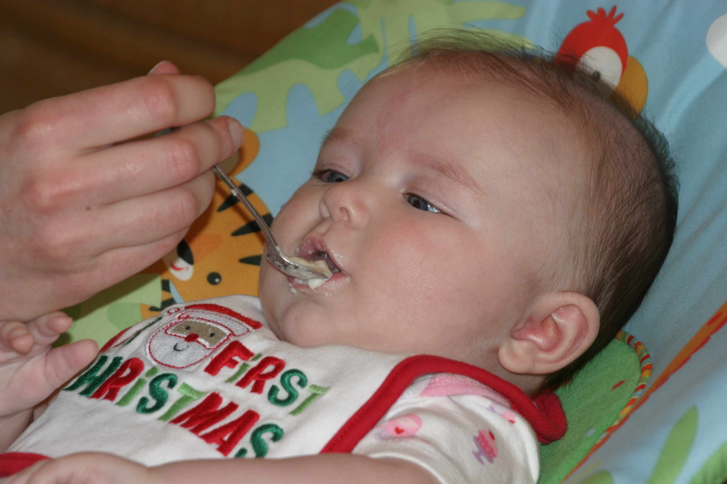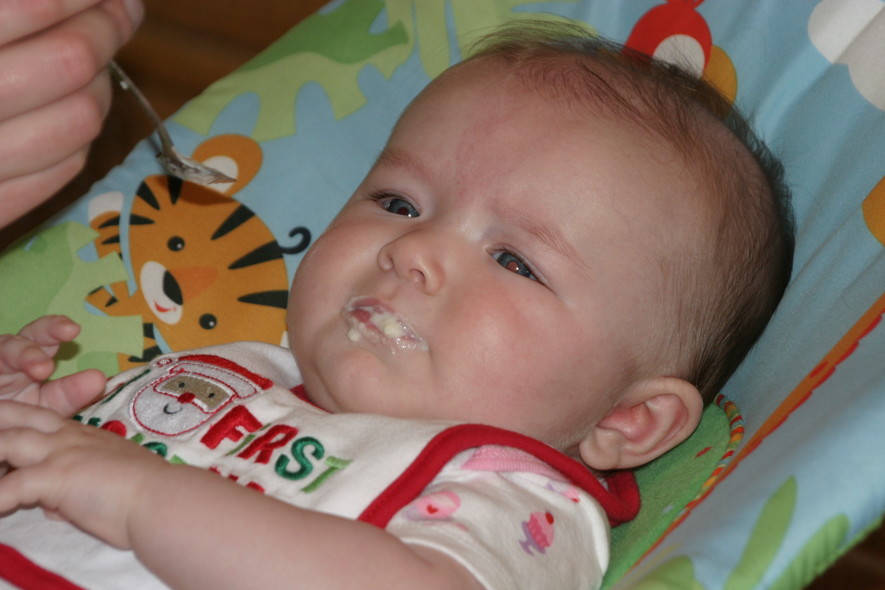 On the last day of 2010 (in Florida), we fed M her first “solid” food. She had actually had this rice cereal before, in her bottle, when she was having reflux (didn’t seem to help or hurt then). It was her first time eating it at this thick consistency, and off of a spoon. She did great! Soon we’ll move on to vegetables and then fruits. The problem is that the doctor suggests introducing new foods in the morning, and we are so busy trying to get out the door in the mornings! Guess we’ll be starting new foods on the weekends.