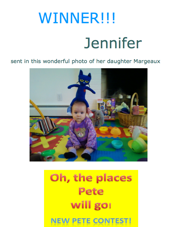 About a week or so ago, I went to the Pete the Cat website to check it out. I saw that they do a photo contest and I sent in this adorable photo Ryan took of M. And she won! They are sending us a free print of Pete and we chose this one.