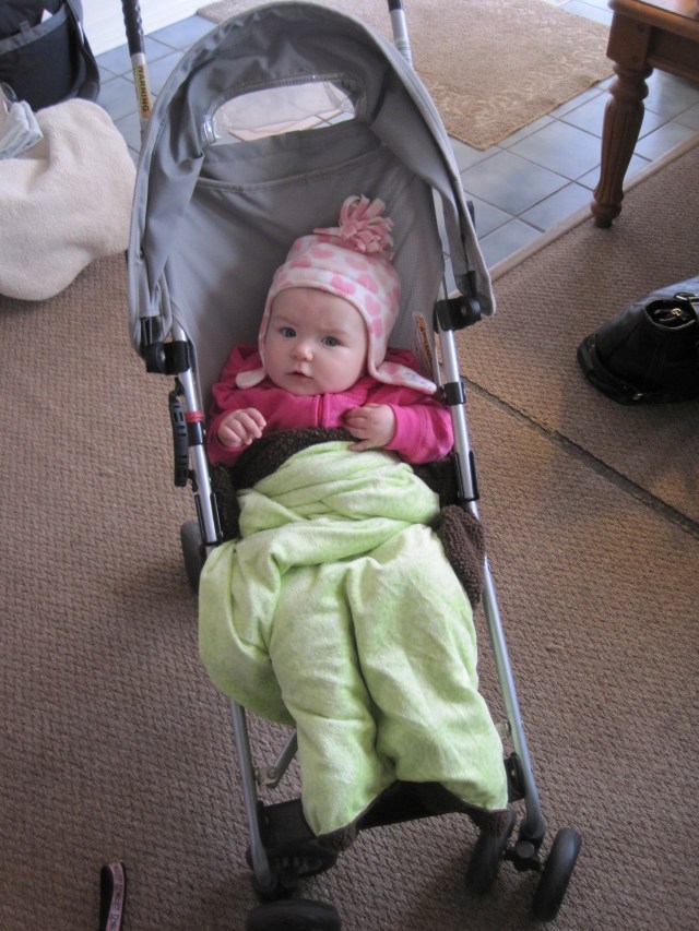 Even though it’s officially spring, it’s still cold around these parts. We’re so ready for spring, so we’re going out for mini-walks anyway! M has graduated to the umbrella stroller! Thanks, Andrea!