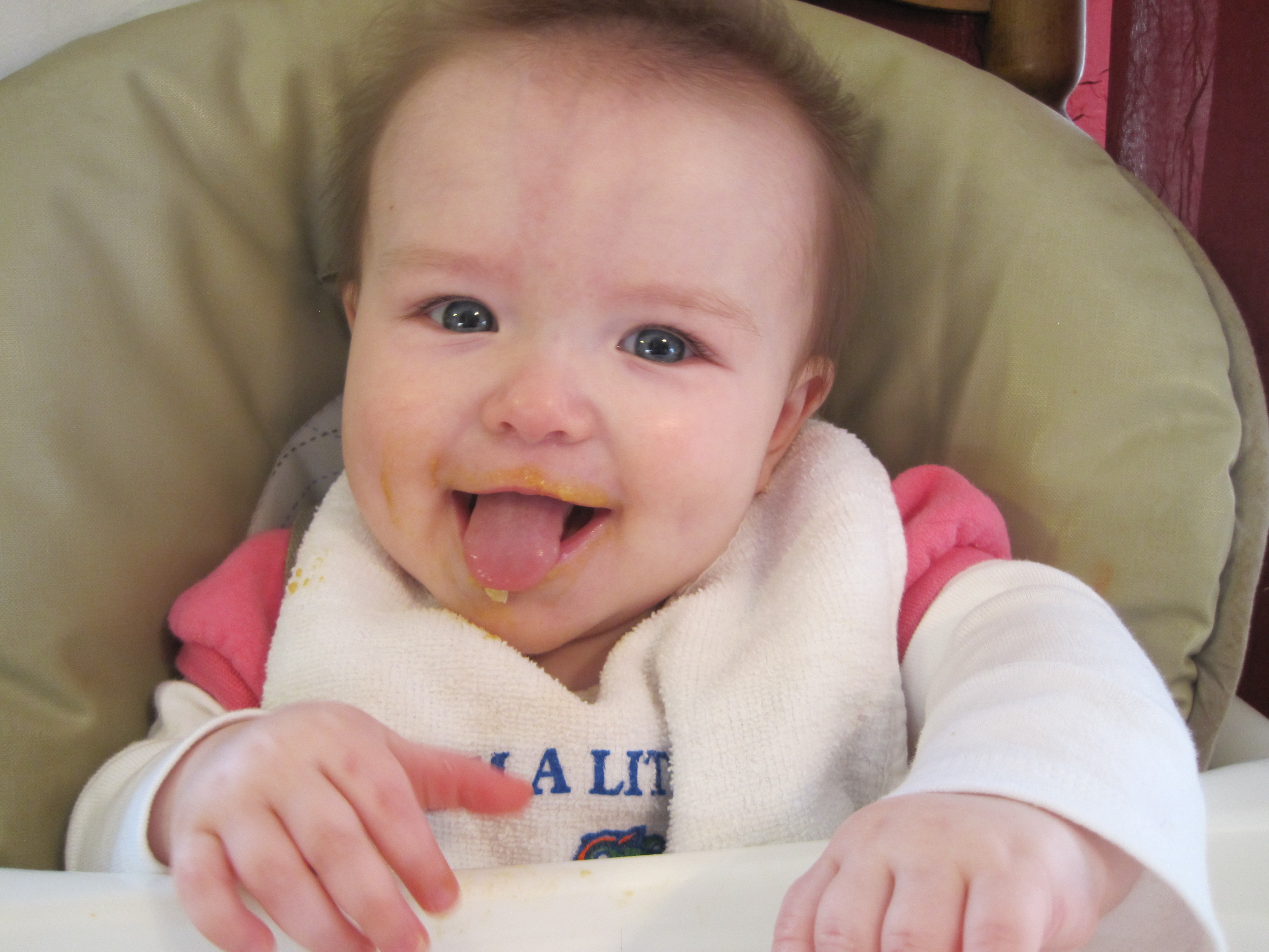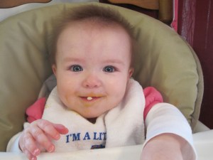 M is slowly but surely eating what I like to call People Food. She’s trying out lots of pureed baby food, but just isn’t that into it. I’ve been putting puffs on her tray, so she’ll get used to seeing and touching them, but she’s yet to get one in her mouth.