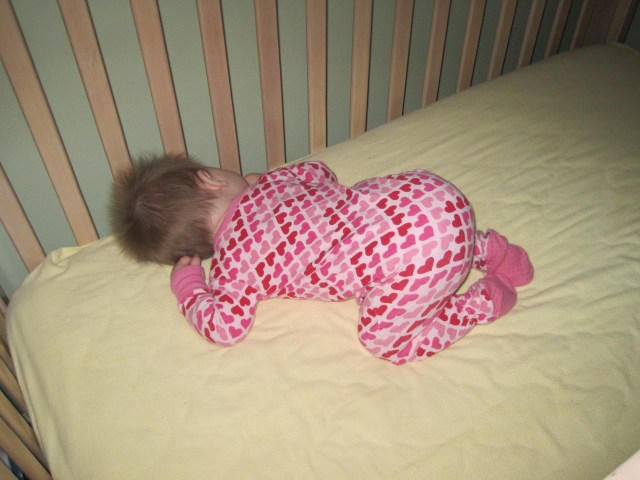 Ah, that is Nolan’s sleeping position. It is so cute! N tucks his arms under his tummy but the butt is up in the air. I hope she sleeps better for you now