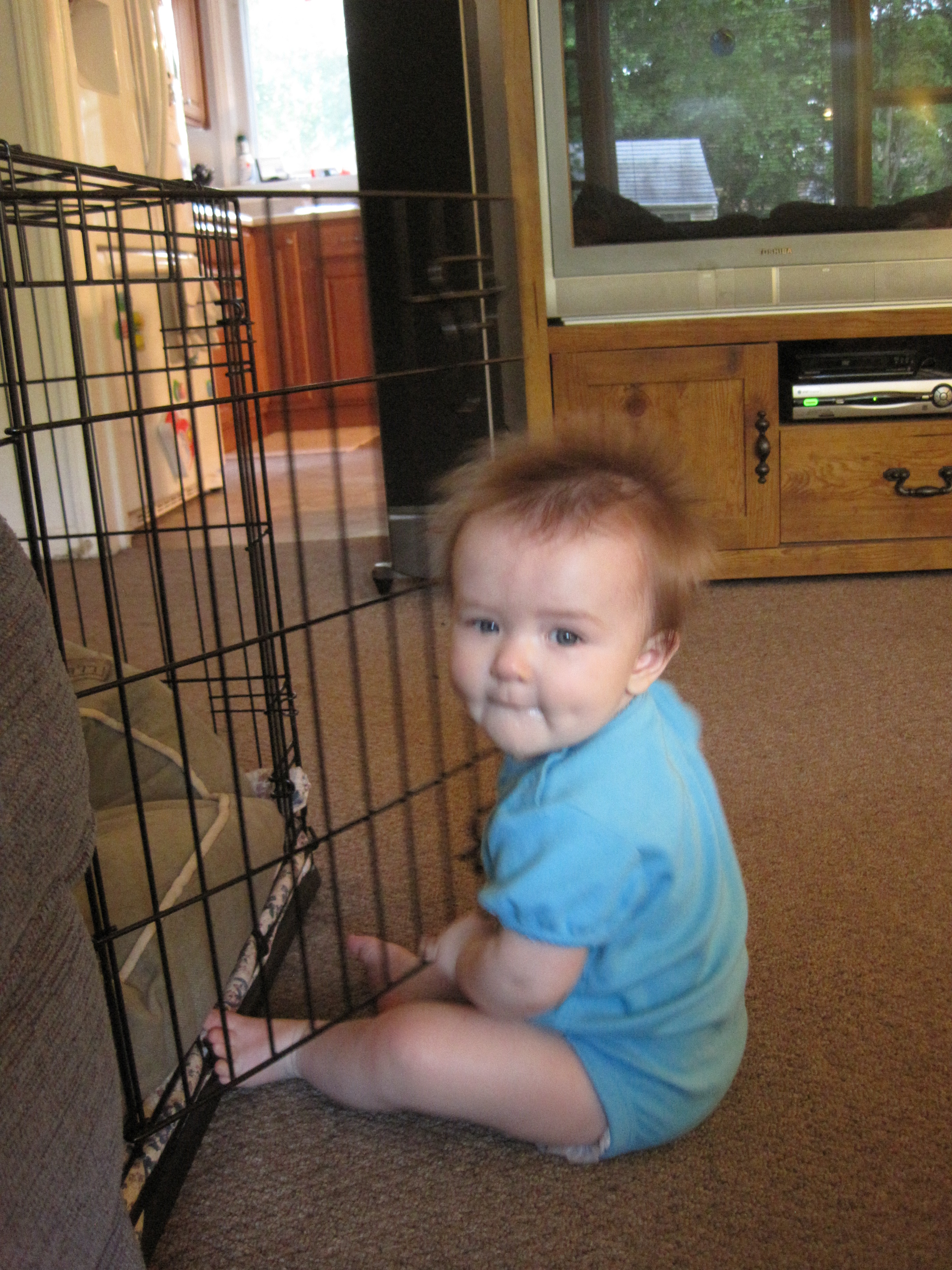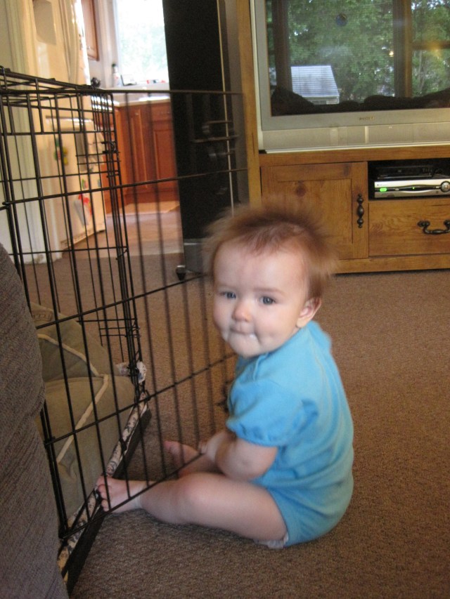 She loves opening and closing the door to the dog’s crate.  Izzie is not a fan.