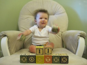 M is 11 months old! She’s crawling everywhere, she’s pulled up to standing a couple of times and while she was sleeping through the night, she didn’t do much of that this month. She’s had her first case of pink eye in both eyes but slept through the night the whole time she had it. It continues to get harder and harder to get a good monthly photo since she grabs at everything, so I am including a few outtakes.