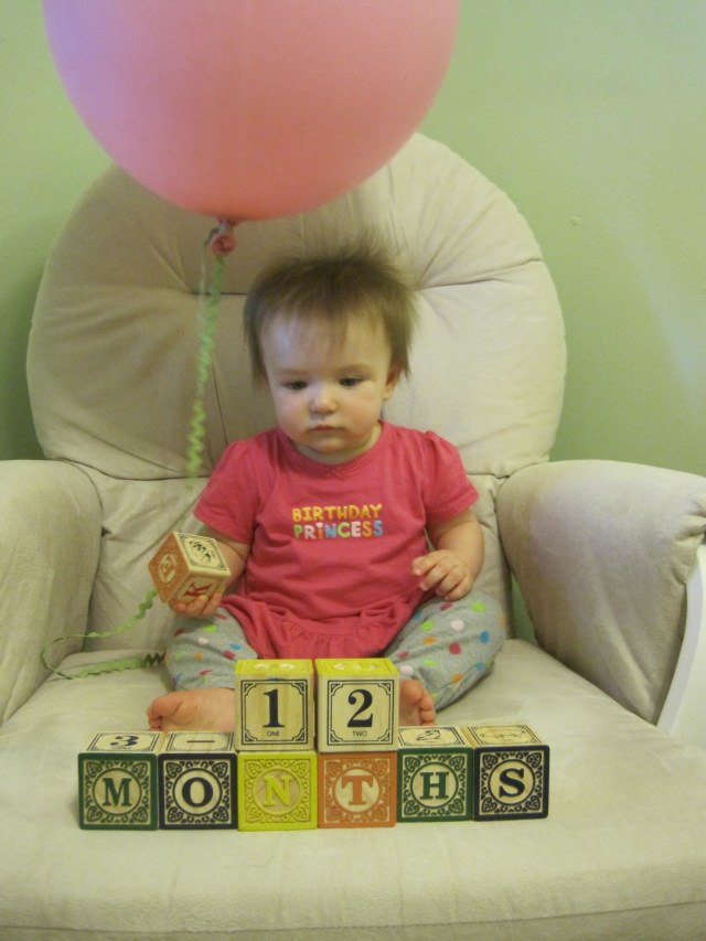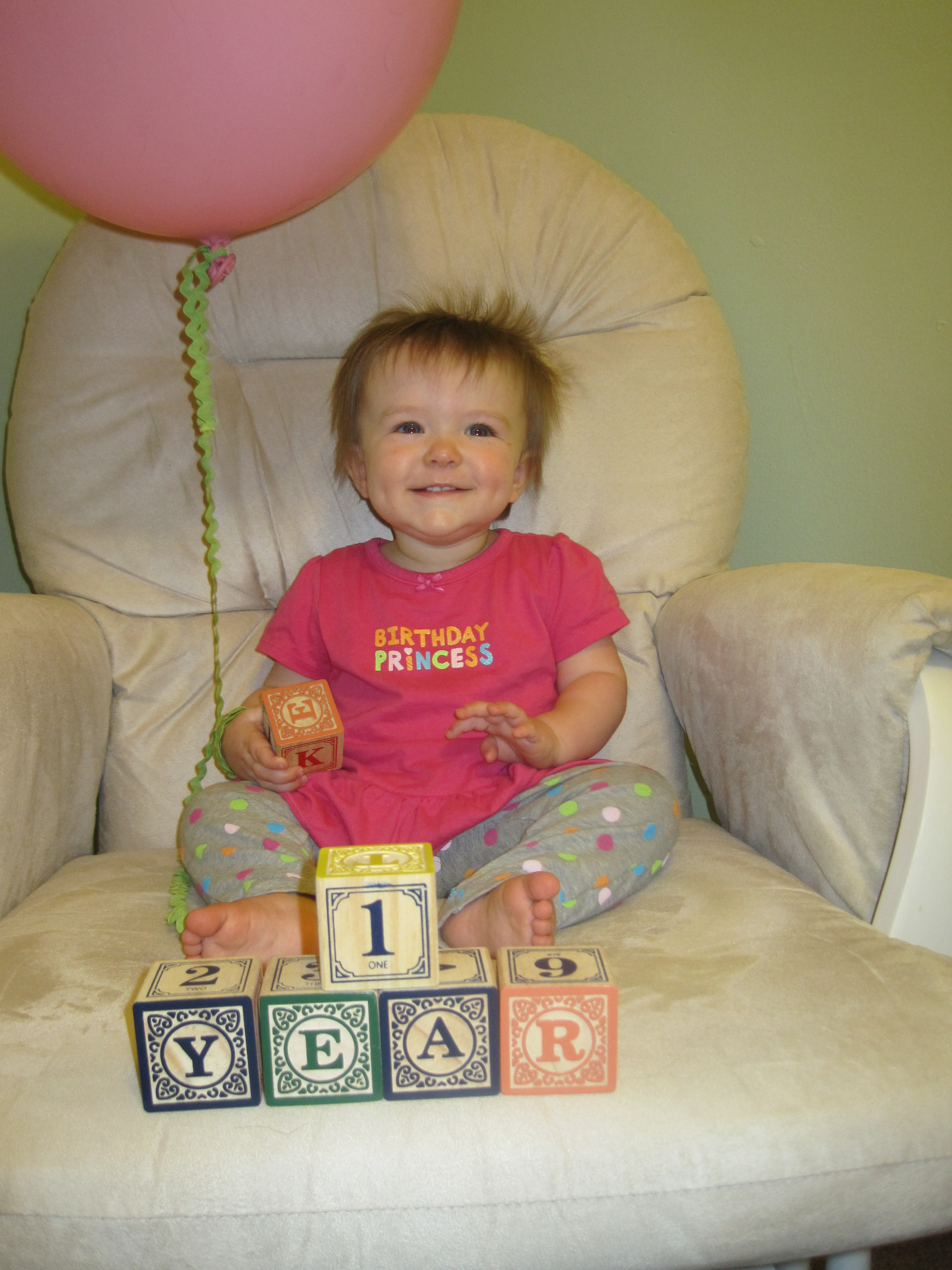 She claps, points, waves, furniture surfs, walks with assistance and is starting to be very verbal even though we don’t understand her “words.” She loves talking on her fake cell phone and walking behind a push toy (not at the same time). Her favorite is opening and closing doors and cabinets.