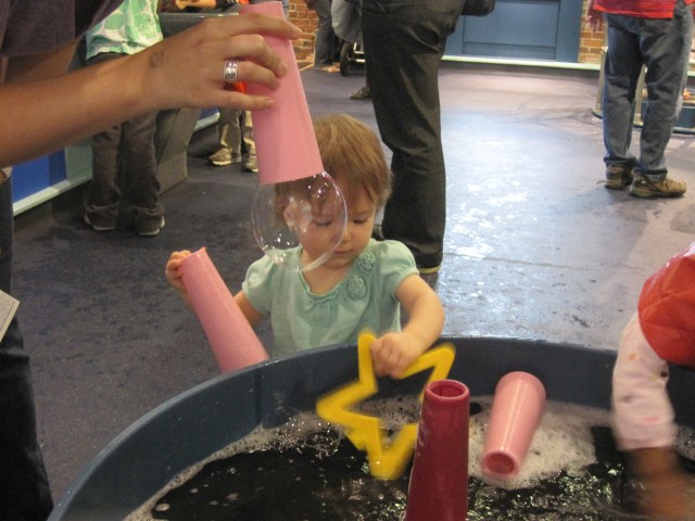 After she finished her shopping, we headed over to the bubble room.  She liked watching Amy blow bubbles and liked putting her hands into the bubbles.  But soon she got tired and starting rubbing her eyes, and thus rubbing the soapy water in her eyes.  So we washed her face and headed out to Amy’s new apartment.