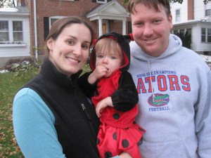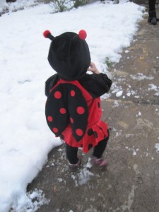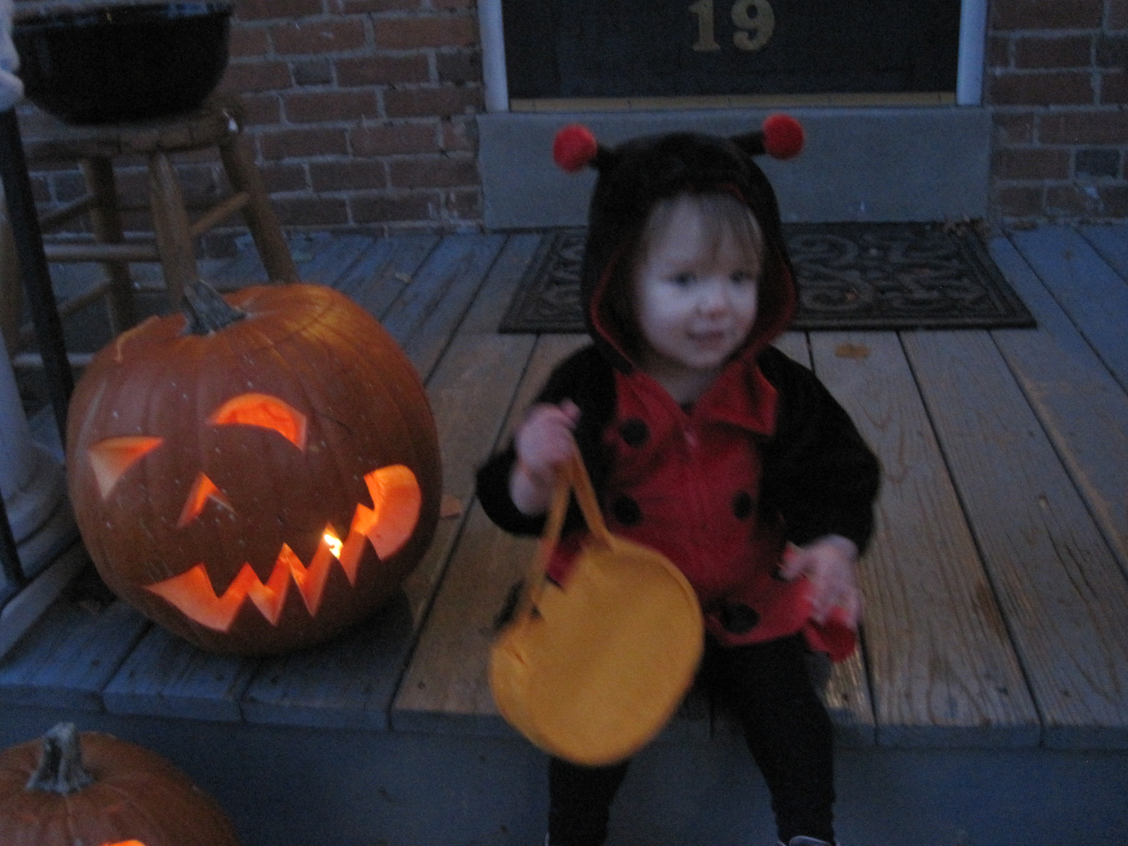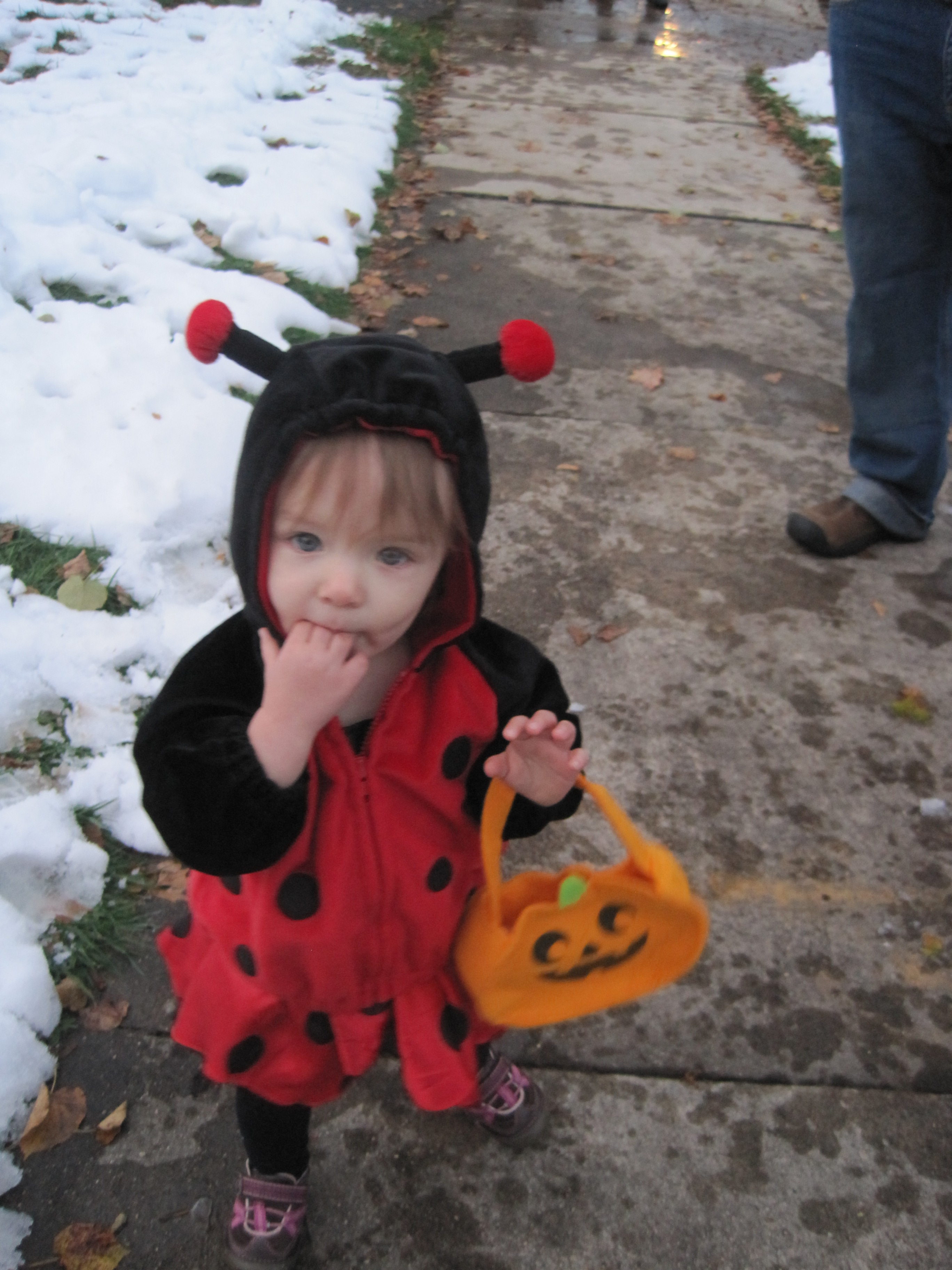 Halloween/Trick-or-Treating was cancelled due to the storm, all the power outages and downed power lines.  We were staying the night at my boss’s house.  His next door neighbor was having a big pizza party for all of the neighborhood kids, and the parents decided to let them trick or treat at a few houses.  R arrived with M’s costume (and the dog and cat) just in time.  We got settled in, and changed M (screaming) in to her costume.  Once she was out on the street with the other kids she was having a ball, running up and down the sidewalk laughing.