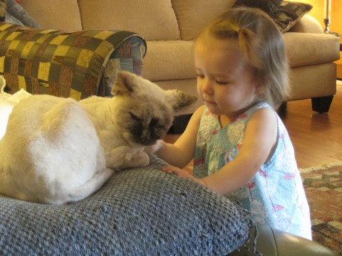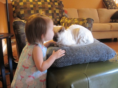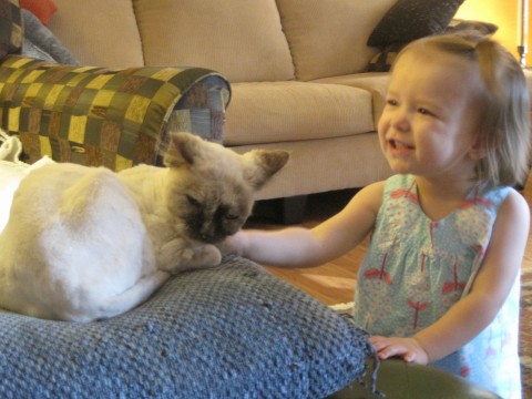 Miss M finally found a kitty that would take all her lovin’.  Miss Sammi was such a champ, letting M pet her, kiss her, hug her and just generally abuse her.  Luckily, M doesn’t try to pick kitties up just yet!