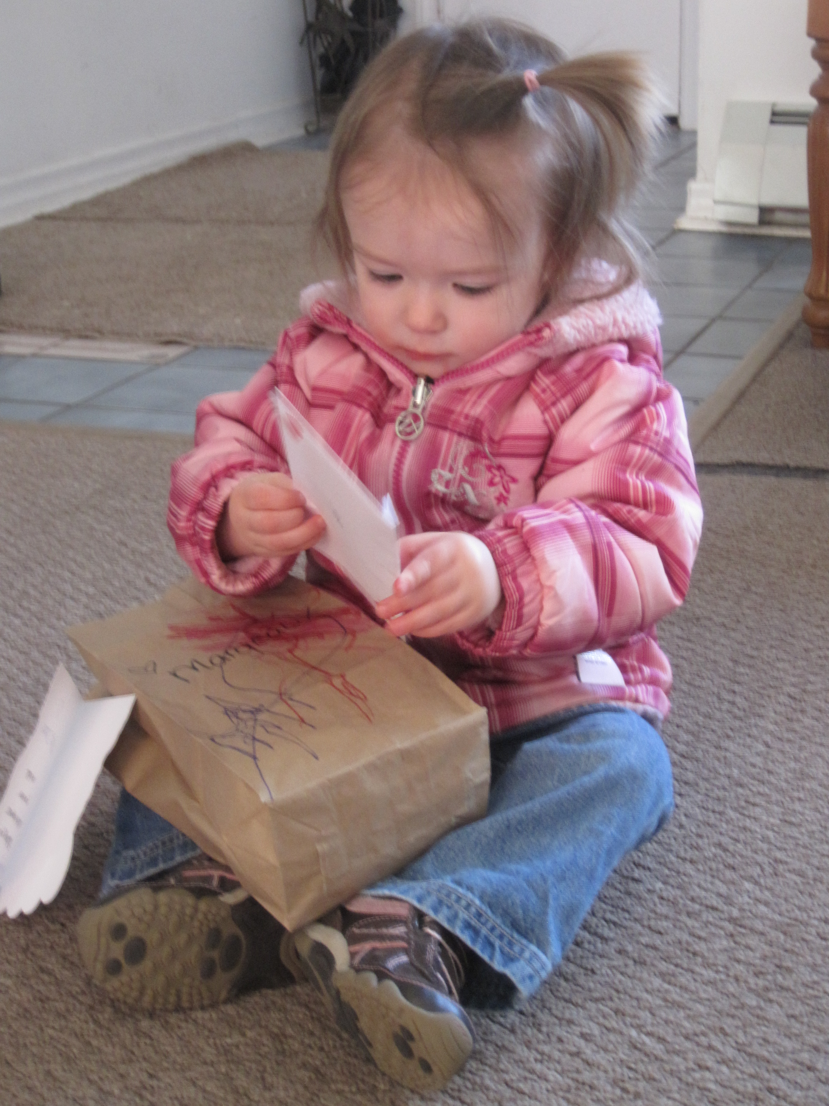 Valentine’s Day Fail: M came home with Valentines from most of the other kids, and we sent none. I figured she was too young and upon asking the daycare it sounds like most of the kids who do the Valentines have older siblings, so I’m not a complete failure. I thought I wouldn’t care about that kind of stuff (I was even saying I didn’t care about 10 minutes before I picked her up), but it was super cute looking through all the little Valentine’s from her friends. My heart hurt a little, anticipating the day she’ll come home and say she didn’t get one from “so and so.” But I can’t be worrying about that kind of stuff already.