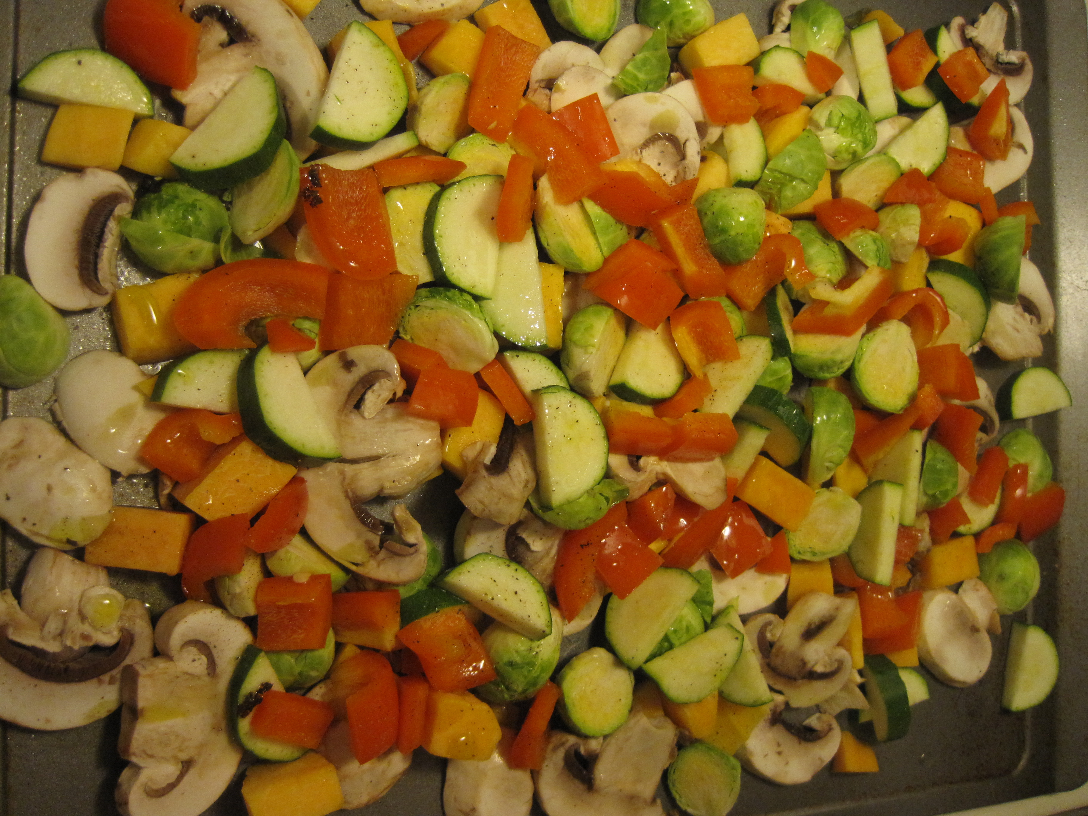 Fell off the wagon for a week while I was sick (still recovering from that), but I finally tried another new delicious recipe from Whole Food Kitchen. This time it was Maple and Tamari Roasted Rainbow Veggies. While I am not sharing the recipes here because it’s a paid workshop and the recipes are copyrighted, this one isn’t too hard to figure out from the name. I used brussel sprouts, butternut squash, mushrooms, orange pepper and zucchini. All I know is, this recipe resulted in my buying a huge jug of maple syrup and only using a small amount, so I see some homemade pancakes in our near future!