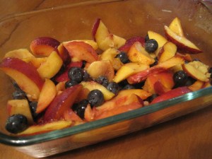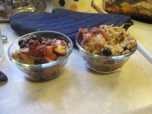 This weekend I tried two more recipes from Whole Food Kitchen. The first was a peach and blueberry crisp. I can never get peaches right. I always cut them too soon, or let them go two long. In this case, at least two of them had several rotten spots. Someone in the nourishment circle community said they used frozen fruit and while good, it was a little too runny. I used fresh for both and it was great! R and I could have easily killed this thing in one sitting.