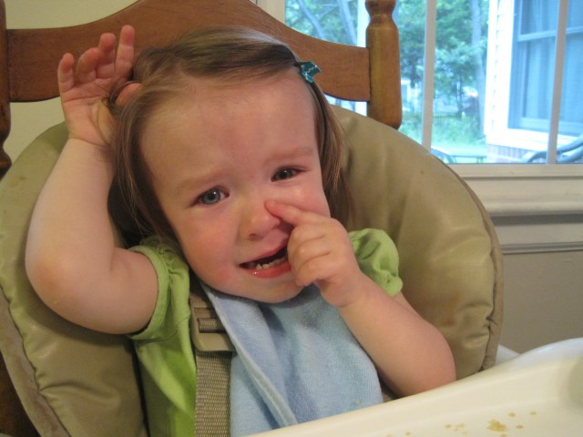 I didn’t really get to enjoy it because this was happening almost the entire time I was trying to eat. She’d ask for something, I’d give it to her, she’d throw it on the ground. Rinse and repeat, with a few different things. Finally I gave up and called my parents to commiserate and tell them I was planning to leave her in the dining room on the phone with them and I was going to go on the back porch to eat my dinner in silence. As soon as she heard GeeMa and GeePa were on the phone, she was all smiles and dinner was saved! Bedtime was finally easier again and has been ever since, knock on wood! I think our new routine after bath and reading is a kiss and a hug and then off to bed.