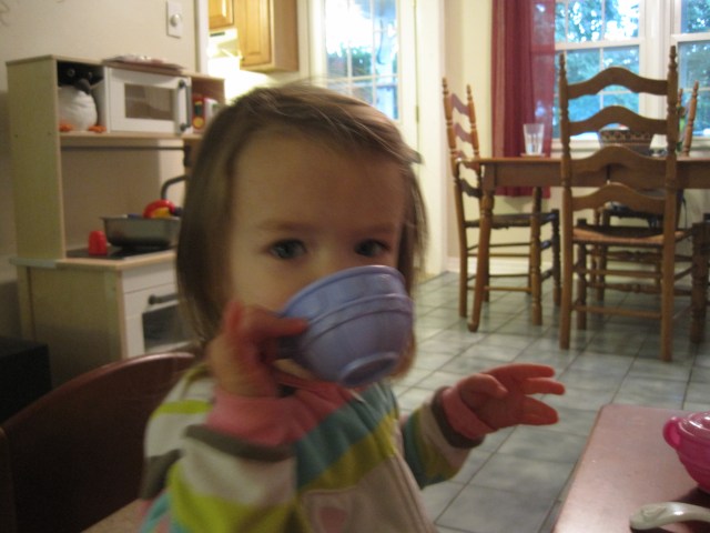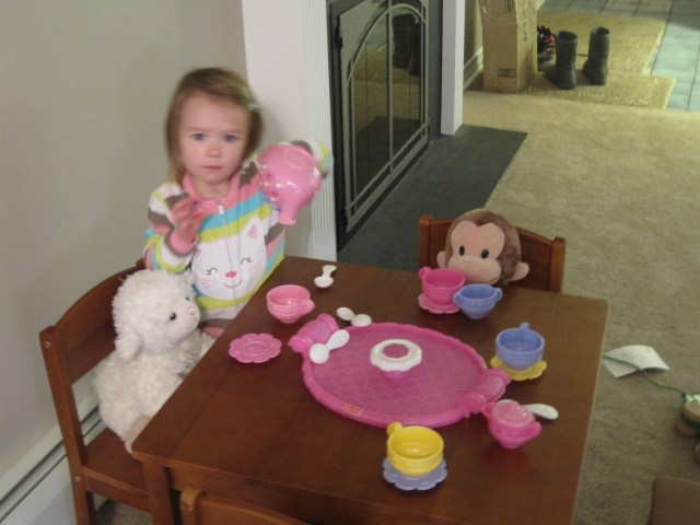 M slept until after 7:30am today! The bad news is it’s rainy and dreary so we won’t be able to build our shed today. The good news is we won’t have to build our shed today. So instead we’re enjoying a nice relaxing morning on the couch after eating cinnamon bun pancakes. M is enjoying a tea party with her friends. R even taught her how lift her pinky finger. Happy Sunday!