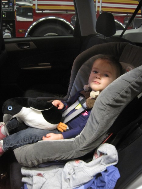 When M was about a year old the national standards were changed and it was suggested that kids stay rear facing until two years old. Bummer, since her rear facing car seat seems to take up so much space even in my SUV. At two we headed back to the fire station for the car seat inspection and were told that at 23 lbs she just did not weigh enough to move to forward facing. She’s now 25 lbs, forward facing in both cars and loving it!