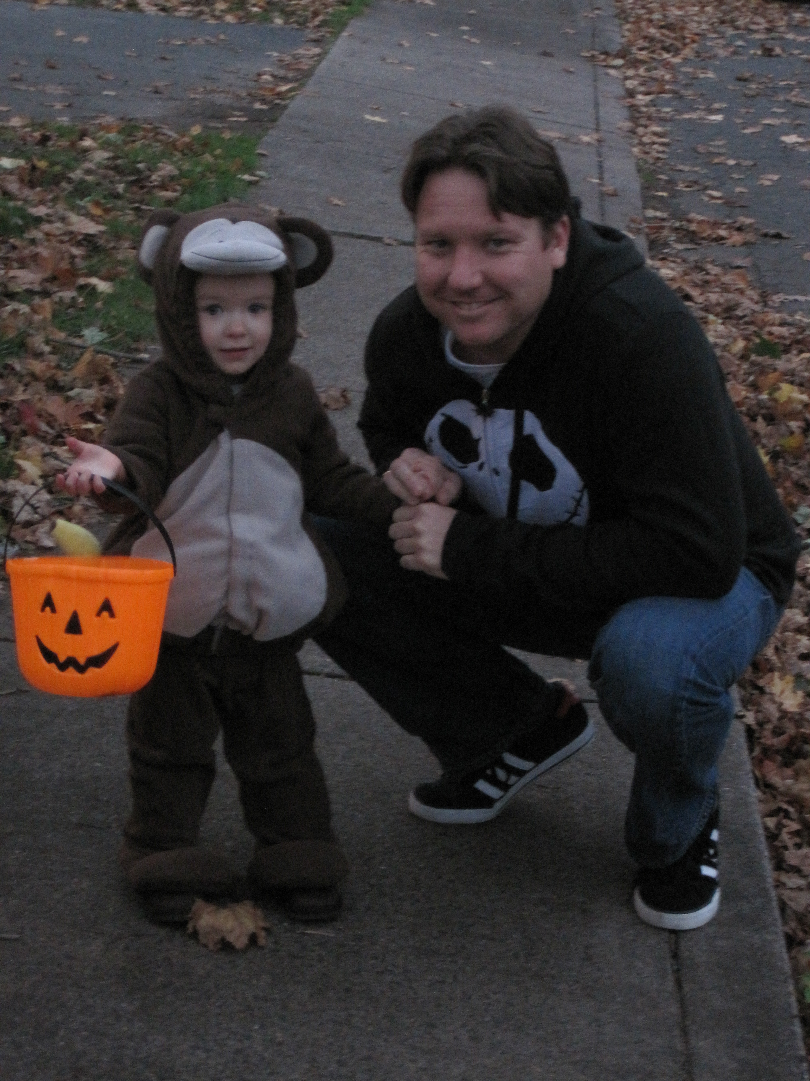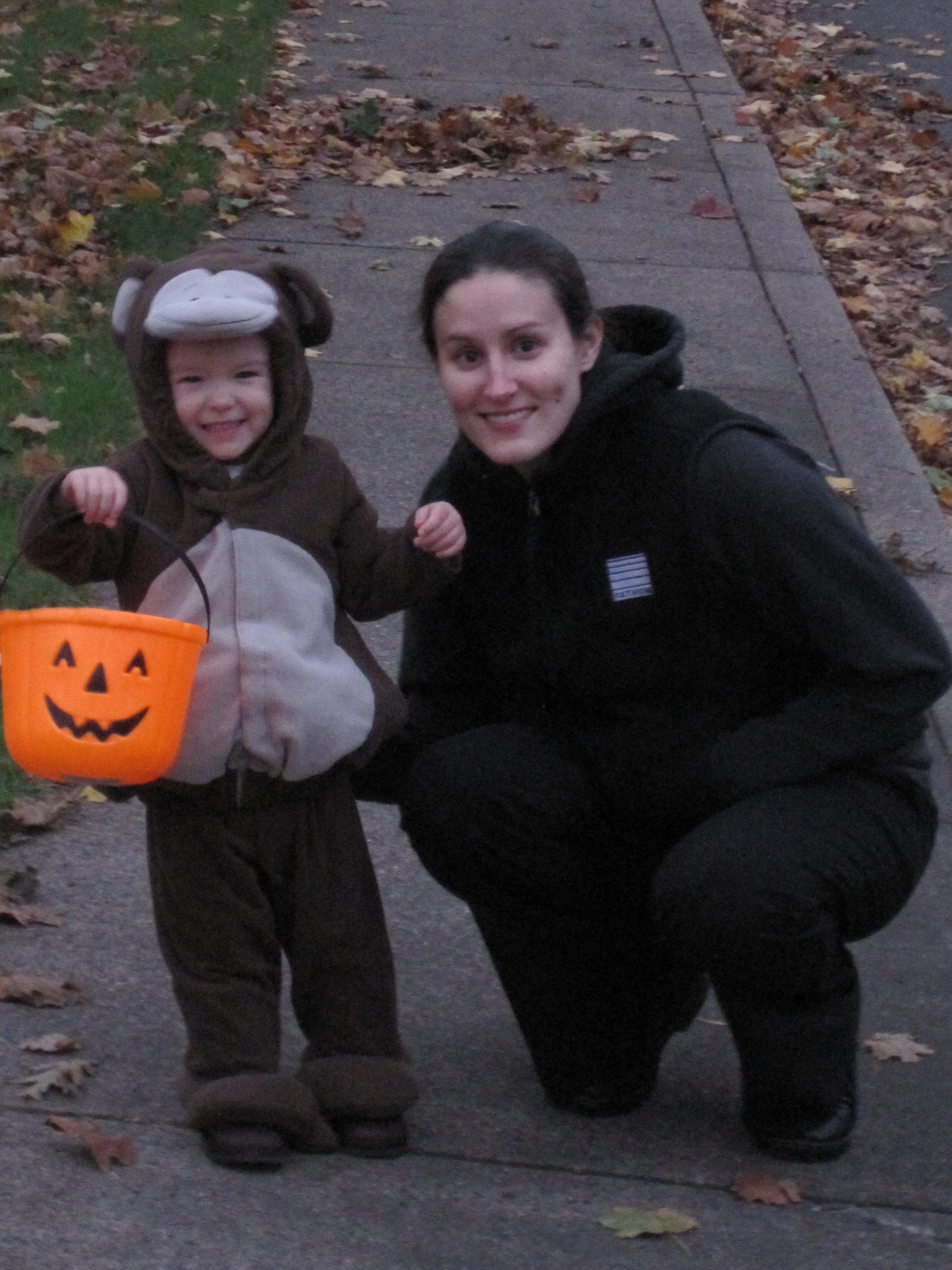 We had a great time trick or treating. We started before dark and hit all the houses neighboring ours. Then R came back to the house to pass out candy and M and I went around the block to visit some friends. She wanted to walk backwards almost the whole way and it took us an hour to go around the block. She had to stop every two houses or so and refuse to hold my hand. She got to eat two M-n-Ms and I’ve eaten the rest of her candy already.