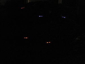 We didn’t get all the decorations out this year because of the storm, but I did try something new that I saw on Pinterest. I saved old toilet paper rolls, cut eye holes and put glow sticks in them in the bushes. It turned out pretty cool.