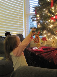M was really excited about decorating the tree this year and it was super fun to watch her put ornaments on the tree. Who cares if they are all at the bottom?