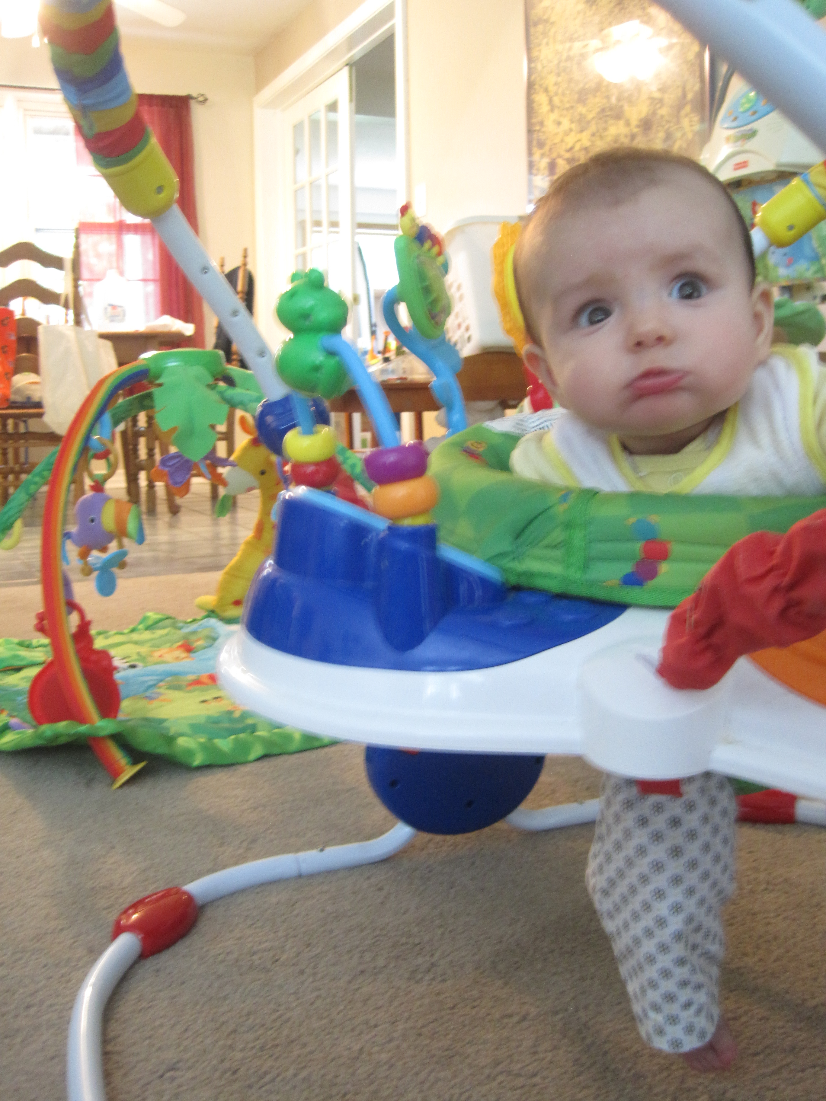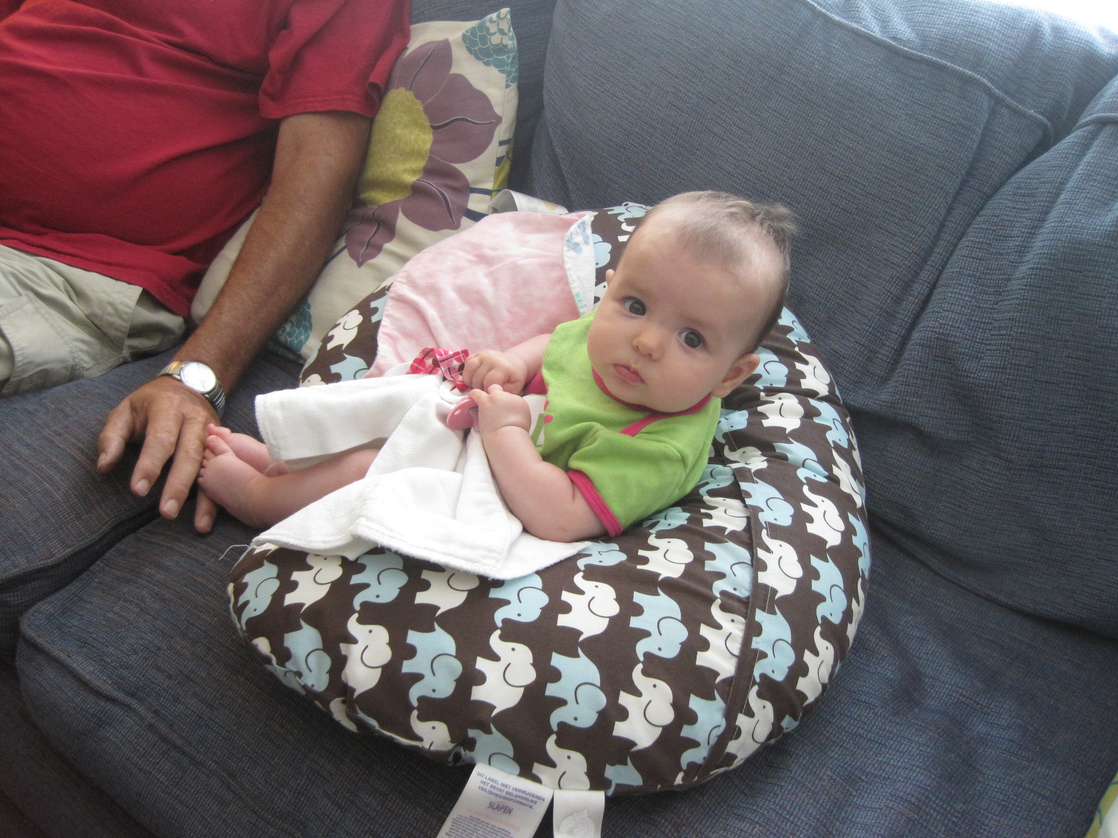 S is getting big fast. Here she is sitting up on the couch with the aid of her boppy pillow and trying out the bouncer for the first time (she can’t quite reach the ground).