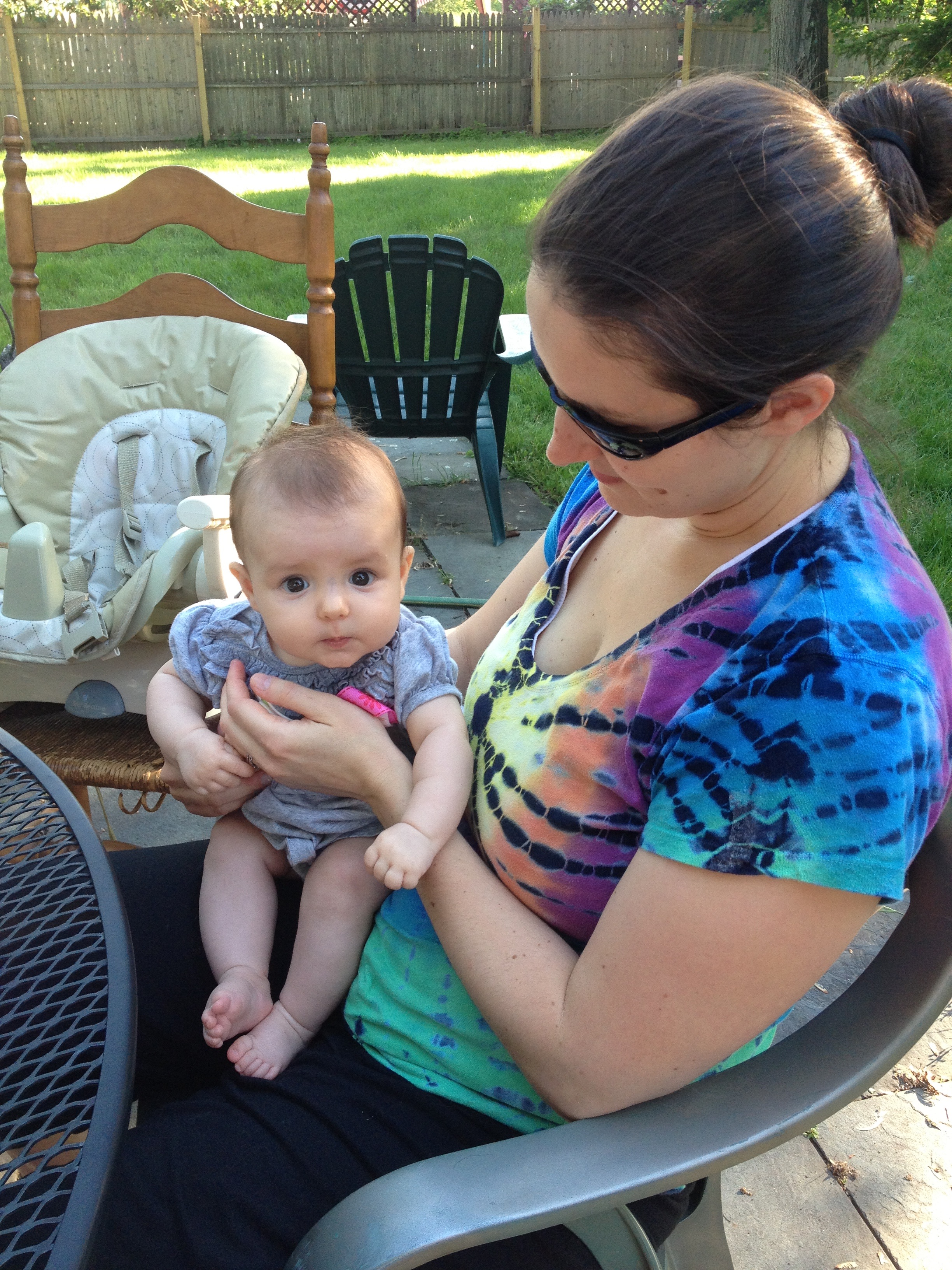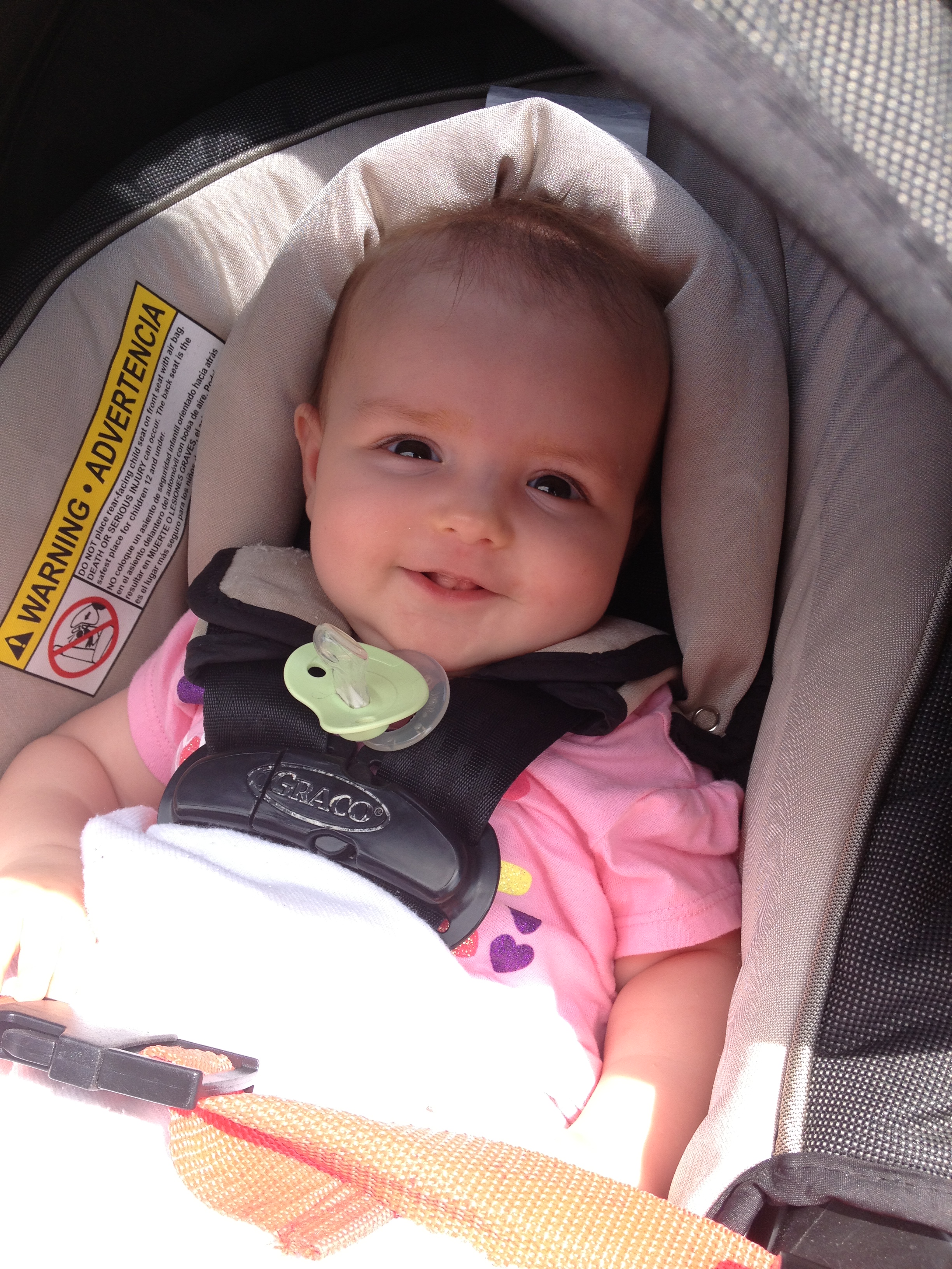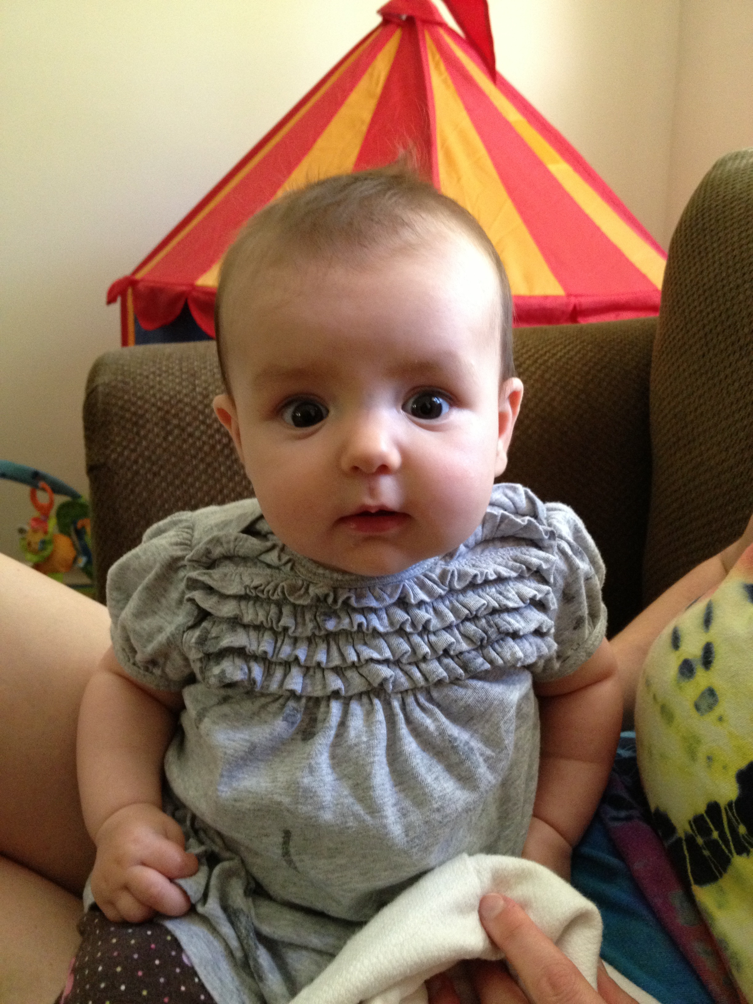 Last Thursday we had two important appointments. The second one (I’ll write about the first one tomorrow) was to take S to the eye doctor. At her four month appointment her pediatrician thought she might have seen some exotropia in her left eye and wanted us to have it checked out. Taking a four and a half month old to the eye doctor didn’t sound like any fun to me, but it actually wasn’t too bad. These people are total pros! They even dilated her eyes. And I can’t believe they can tell this on a four month old, but – she’s extremely far sighted. It’s not so much the farsightedness that is the issue but that children accommodate for this by straining their eyes to see correctly and this can therefore cause a cross-eye or a lazy eye. She’ll have a follow up appointment in four months, when she’s eight months old. I didn’t ask a lot of what if questions. Believe me, I wanted to. But it doesn’t change anything, so we’ll just deal with it at the next appointment if we need to. They start kids as young as six months old in glasses! It was hard to hear that she’s not perfect and hard to hear that she may need to wear glasses (or may grow out of it) because you don’t ever want to think about how cruel kids can be. I just love this kid so much I want her to be this happy everyday!