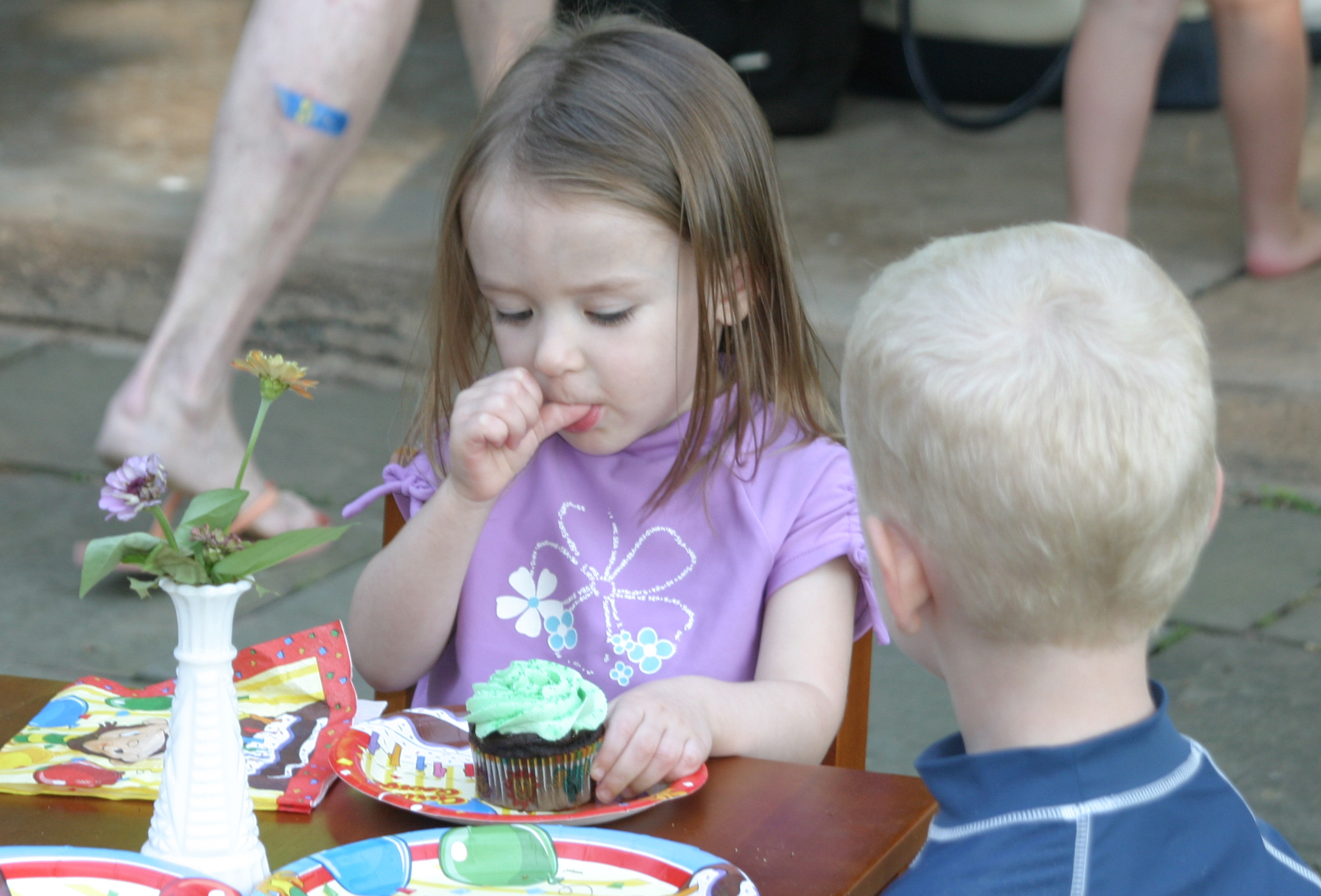 We were so bogged down with the recovery from her having her tonsils and adenoids out that we really didn’t get it together to do much preparation for her birthday! But I threw together a pretty nice last minute (for me) party in our backyard. She’s really into monkeys and super into Curious George, so we had a Curious George themed party. I made a fabric banner out of monkeys dressed as ballerinas. We had cupcakes decorated with monkey toppers. She had a Curious George birthday shirt as did S and Grandpa R. We had about 8 kids and several adults. She had four kids from her school, two kids from my bookclub and two kids from my office. We had a sprinkler, a small inflatable pool, a sand table, bubbles, her new blow up soccer goal and balls and her play set. It was a really fun time!