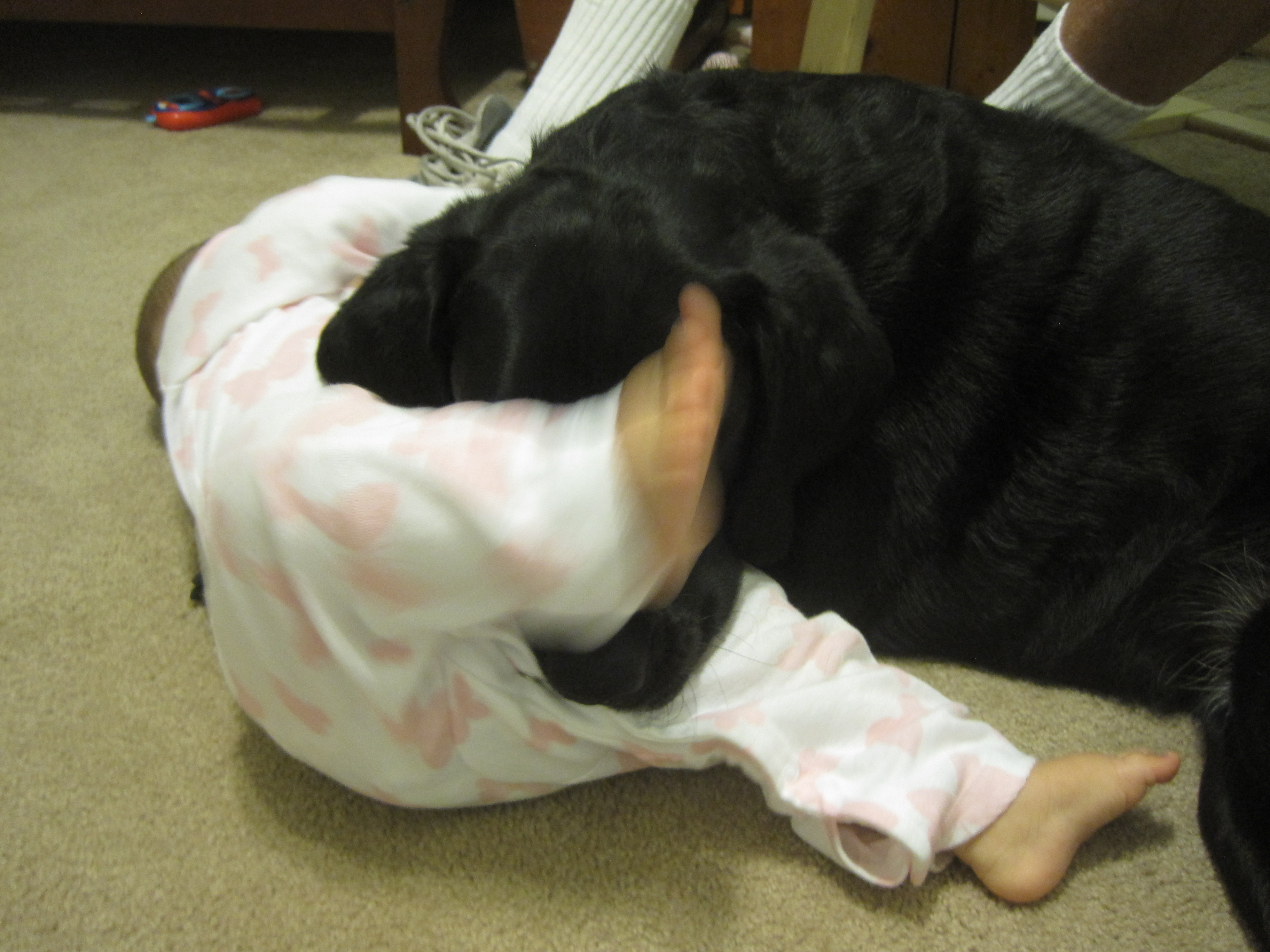 S has really started paying attention to the animals. She loves watching the cat, especially if you’re holding (or nursing) her on the couch and the cat walks across the back of the couch. These photos don’t even begin to show how cute it was when S rolled herself over onto Izzie’s leg. Izzie is so gentle, but it still sometimes amazes me that I let this 60lb animal cuddle up to my baby daughter. It helps that Izzie likes the smell of baby poop and spit up – yuck!