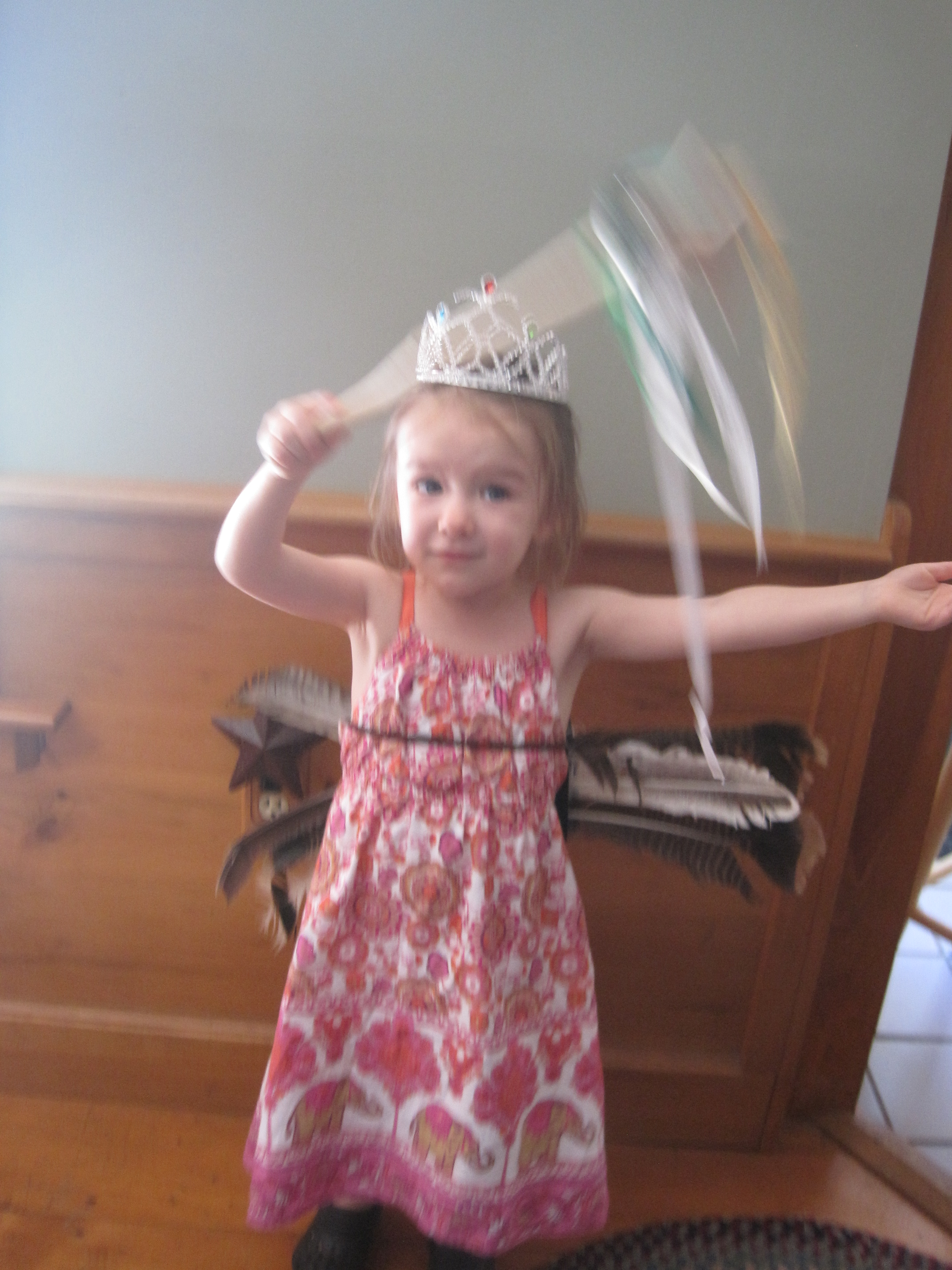 I took M to see R play in the pit at Cinderella a few weeks ago. Then, in New Hampshire a few weekends ago, her cousin got her all decked out in this get-up with wings, crown and wand. You should have seen the super adorable twirl she did – exactly like they did in the play! Here she is mid-twirl. I only wish the photo had come out better, or maybe that I had a video of it. So adorable!