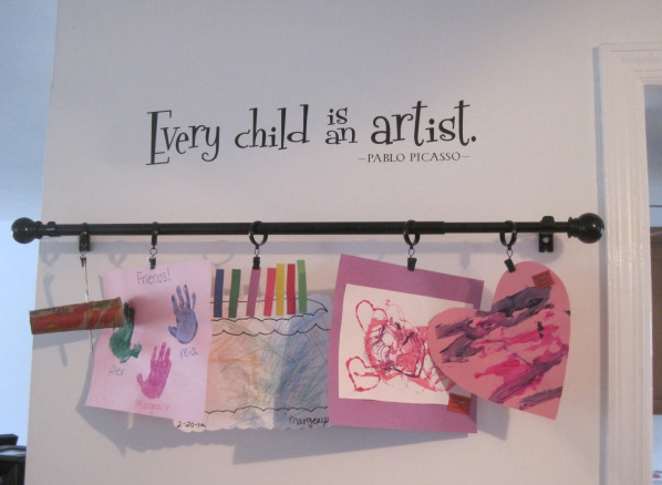 Oh, how I wish I did save all my daughter’s artwork. But, alas, I’m a tosser, not a hoarder. More power to you if you’ve got the space (and the time) to organize and save all of that artwork that comes home from your child’s school or daycare. There are some truly adorable things and then there are some things that are not and even then I feel bad for throwing them away. Will she want a box full of collages made from photos cut out of magazines when she’s 10? 15? 20? 25? Probably not. There are a few select things that I keep, usually things that display the size of her adorable little hands or feet at a certain age. But what to do with everything else? Well, everything gets a turn on display in our dining room. I actually created this from something I saw on Pinterest! And it actually turned out half decent – it’s amazing.