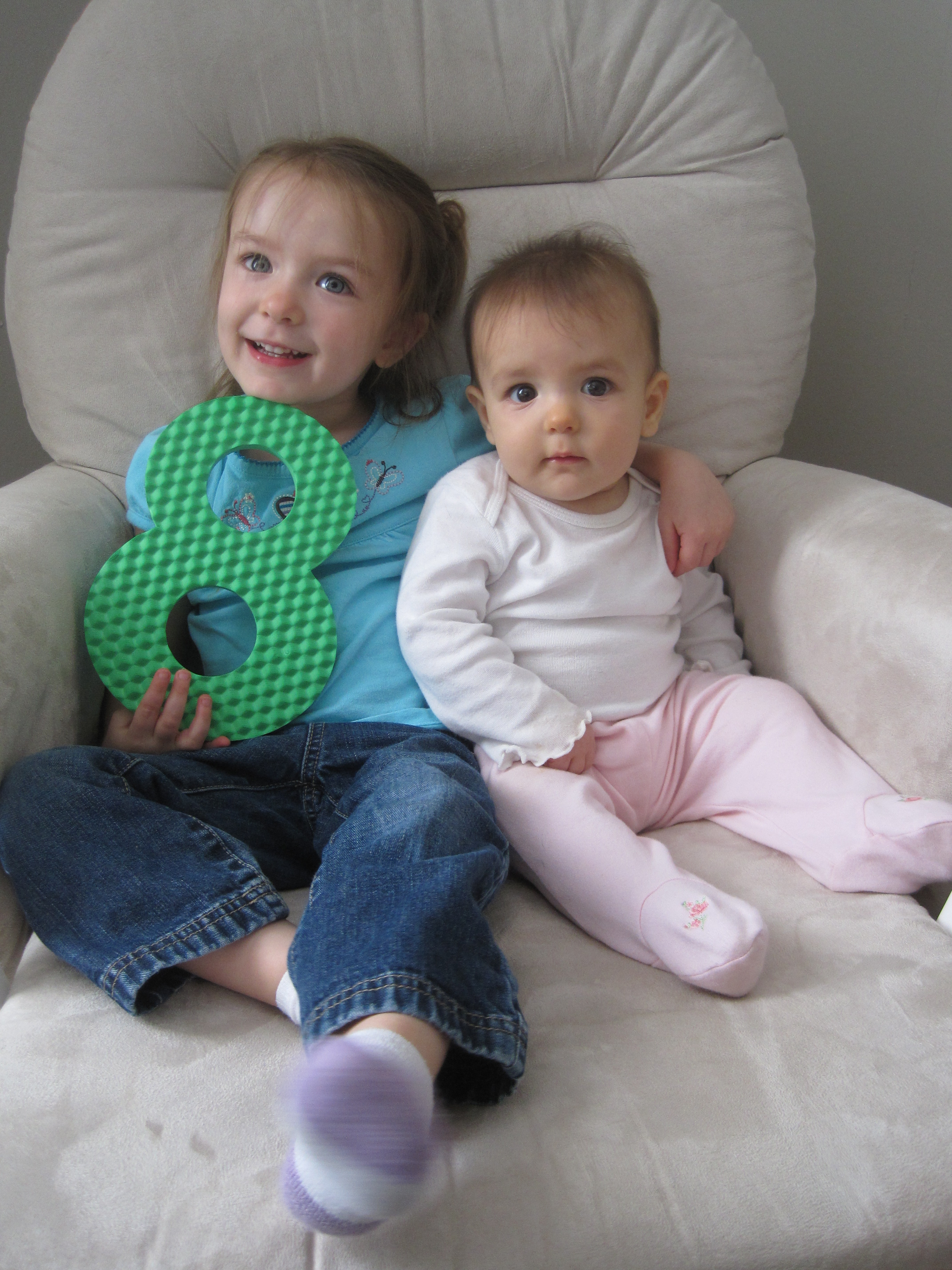 Miss S is 8 months old! She continues to roll everywhere. She can cross the room pretty quickly and get exactly where she wants to go.  As of the last week she can now get from laying on her stomach back to sitting up. She’s starting to be more vocal and has a high pitched squeal. She loves watching M and my mom says she looks for her at lunchtime during the week when she’s at school and not sitting next to her at the table. She sleeps from about 8pm – 5:30am. Still no teeth, but we think there is at least one about to break through. She smiles a lot and laughs some. She loves watching the cat and the dog. She really loves swinging in her swing. She’s taking a 1/2 tsp of Miralax everyday to keep her regular. She really seems to enjoy her baby food. She’s eating some meat baby food and a lot of prunes, sweet potatoes, carrots, squash and pears. She’s just starting to get up on all fours and is also crawling backwards a little bit. I don’t think it will be long before she’s crawling. She grabs for everything in site and puts it all in her mouth. M really wanted to be in her 8 month photo, so I am including one with M and one solo (taken by M). She’s a really amazing baby.