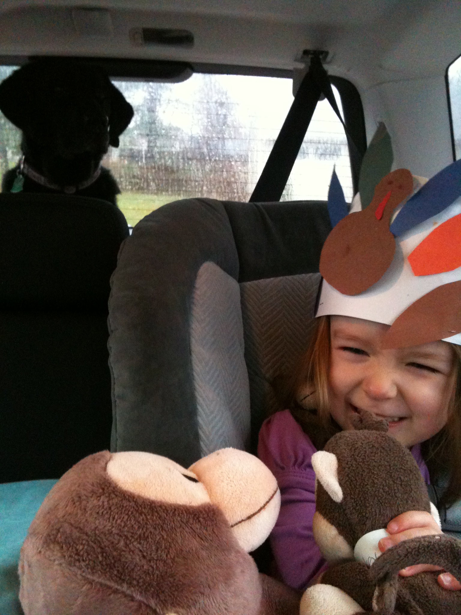 Look how excited M is to be on the road to New Hampshire! And she made an adorable turkey hat at school.
