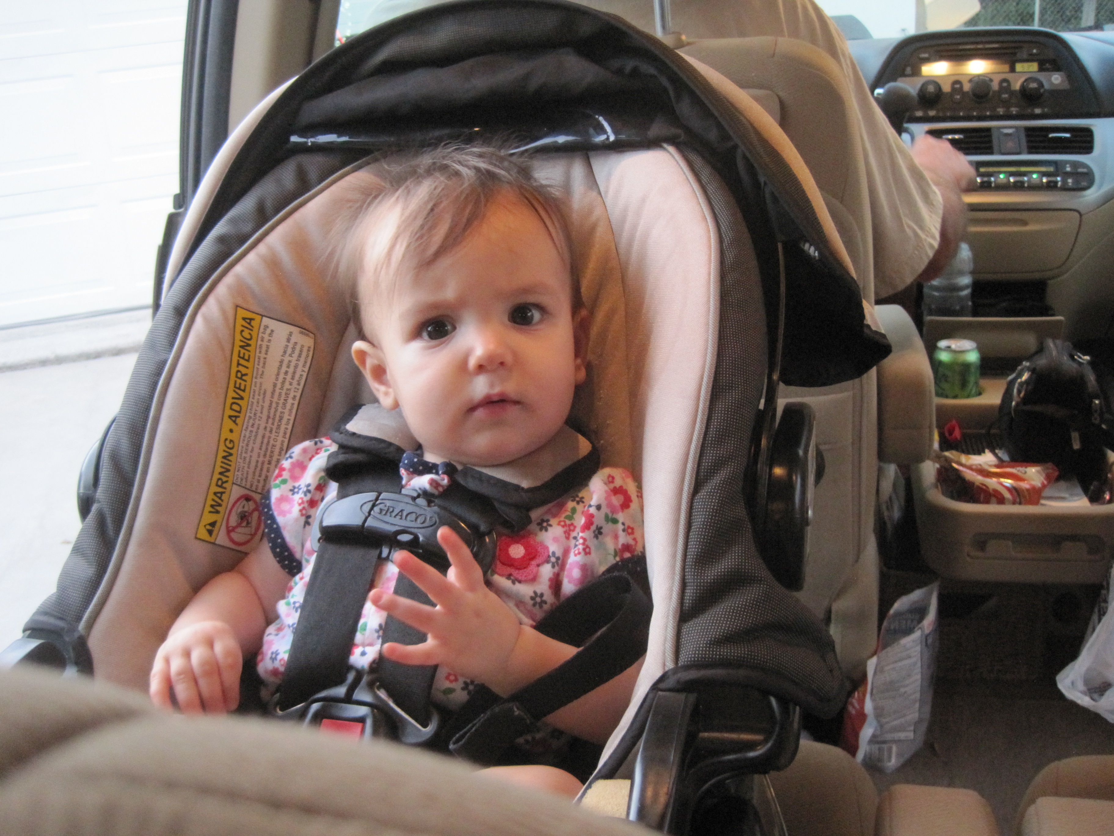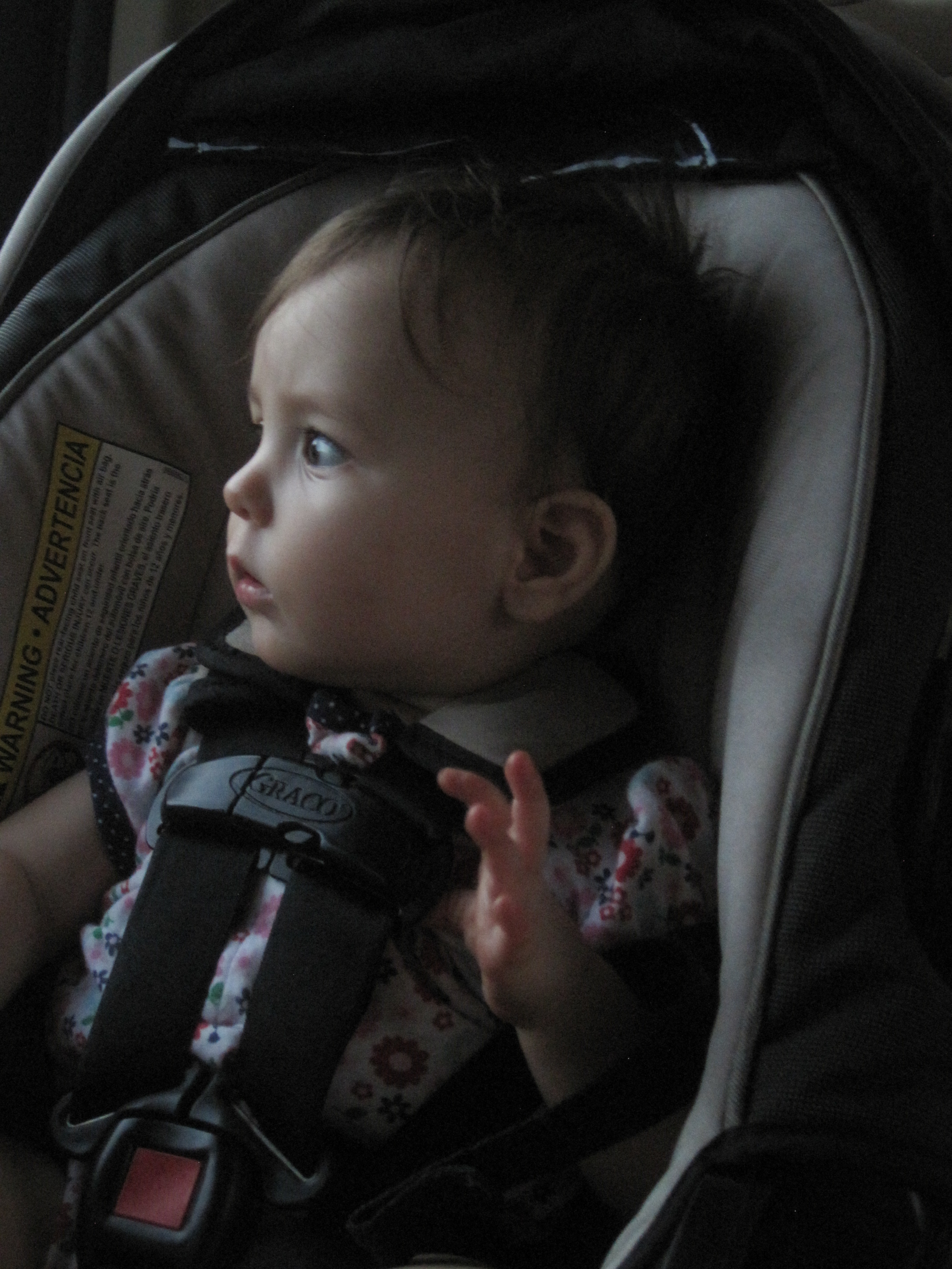 On Christmas Day, S was 11 months old! These photos were taken in Florida and really don’t do her spiky hair justice. I’ll post more photos soon where her hair is in its full glory. It’s starting to really remind me of her sister’s hair at this age. She recently went to the doctor for double ear infections just before our Christmas trip to Florida so I can tell you that she weighs in at 17.5 pounds. She sleeps all night. She has 6 teeth through and I think they are just going to keep coming rapid fire. She’s a total goofball. She crawls, pulls up to standing, furniture surfs, walks behind a push toy, eats anything and everything up without any gagging (unlike her sister did at this age). She’s starting to show interest in climbing! She responds to her name and a few other words, blows kisses, gives big open mouth kisses, claps and while always smile when you sing her Row, Row, Row Your Boat. She’s into everything and wants to touch everything. She knows what she wants, and gets quite upset if that’s taken from her (i.e. M’s toys). She has a distinctive screech that she’s really trying out lately. She puts everything in her mouth, including shoes and dog toys. She likes to dance in her high chair at dinner time.