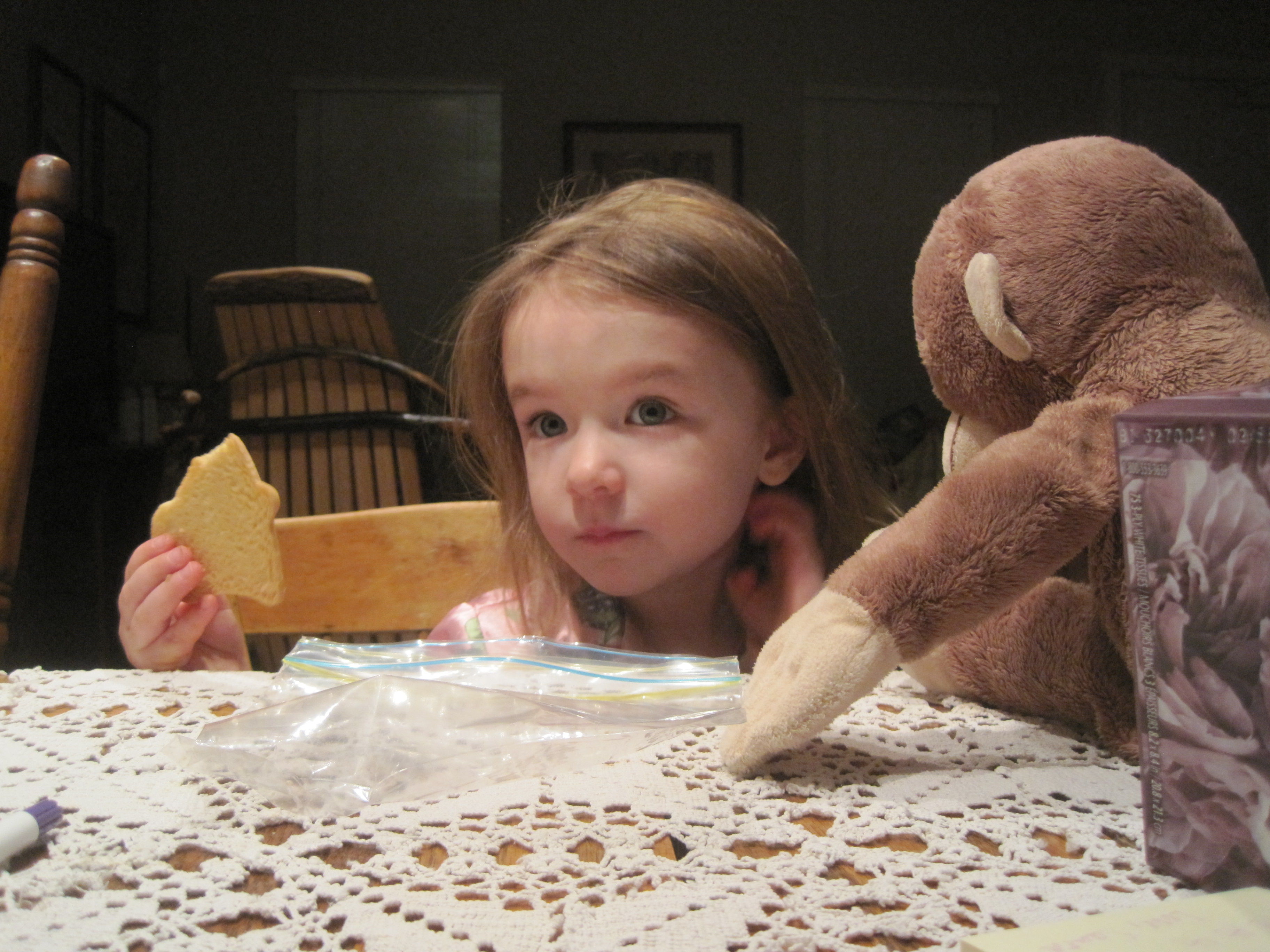 On Christmas Eve, M and S finally got to see there cousins when we went out for dinner with Papa John and family. After dinner, we went over to Grandma Jane’s house to wait for Santa! We left out milk and cookies. In the morning she discovered that Santa had left a note and a cookie – he couldn’t possibly eat all three she’d left and would she eat the third for breakfast? She was really excited about that. Here she is eating the cookie Santa left behind.