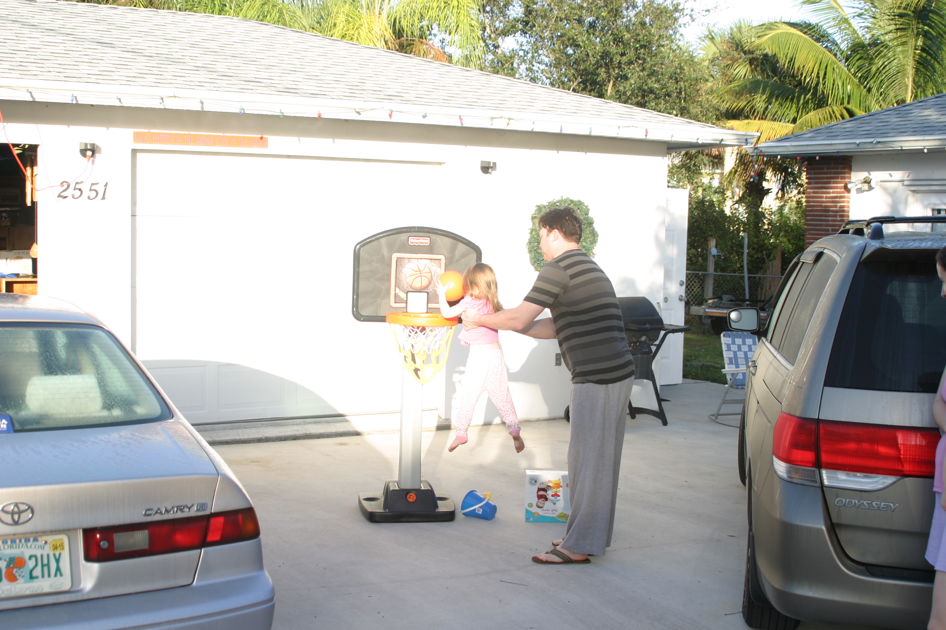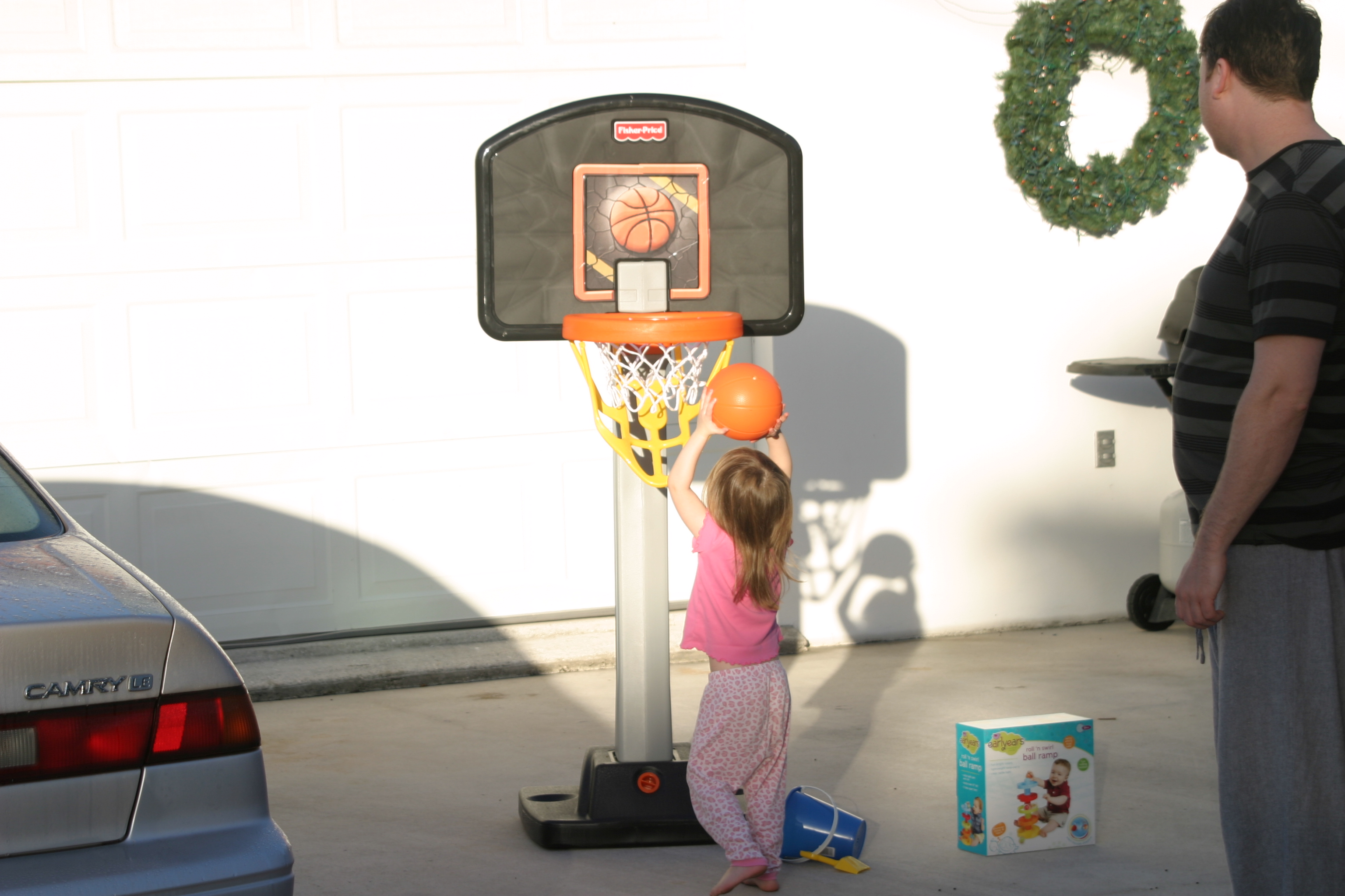 This year when my parents were here M enjoyed counting and spotting all of the basketball hoops around the neighborhood with my parents. Santa thought this might be a present she’d enjoy and I kind of prepped her – would you like Santa to bring you a basketball? Yes! So, all she asked for Santa for was a basketball and a new pair of monkey socks, since she’s outgrowing hers and will give them to S. She got a basketball and a basketball hoop – plus monkey socks in her stocking. Since my mom arranged this present with Santa, we decided it would be ok for Santa to deliver it a day early to Grandma Sue’s house. M loved it and spent lots of time at our play date playing basketball. She even got really good at it!