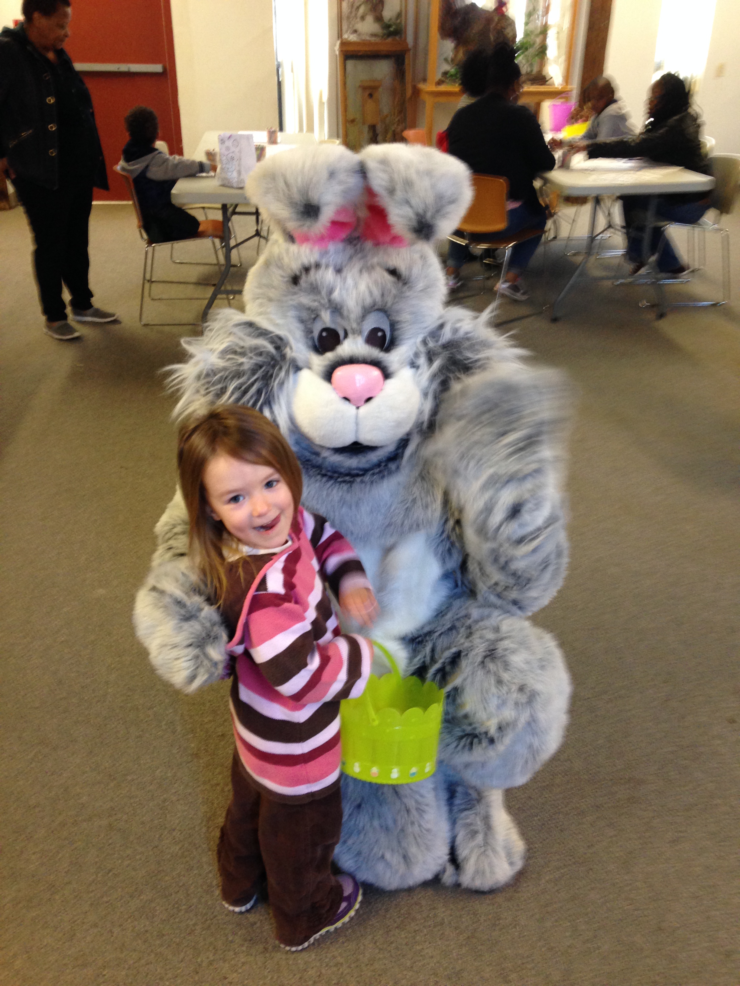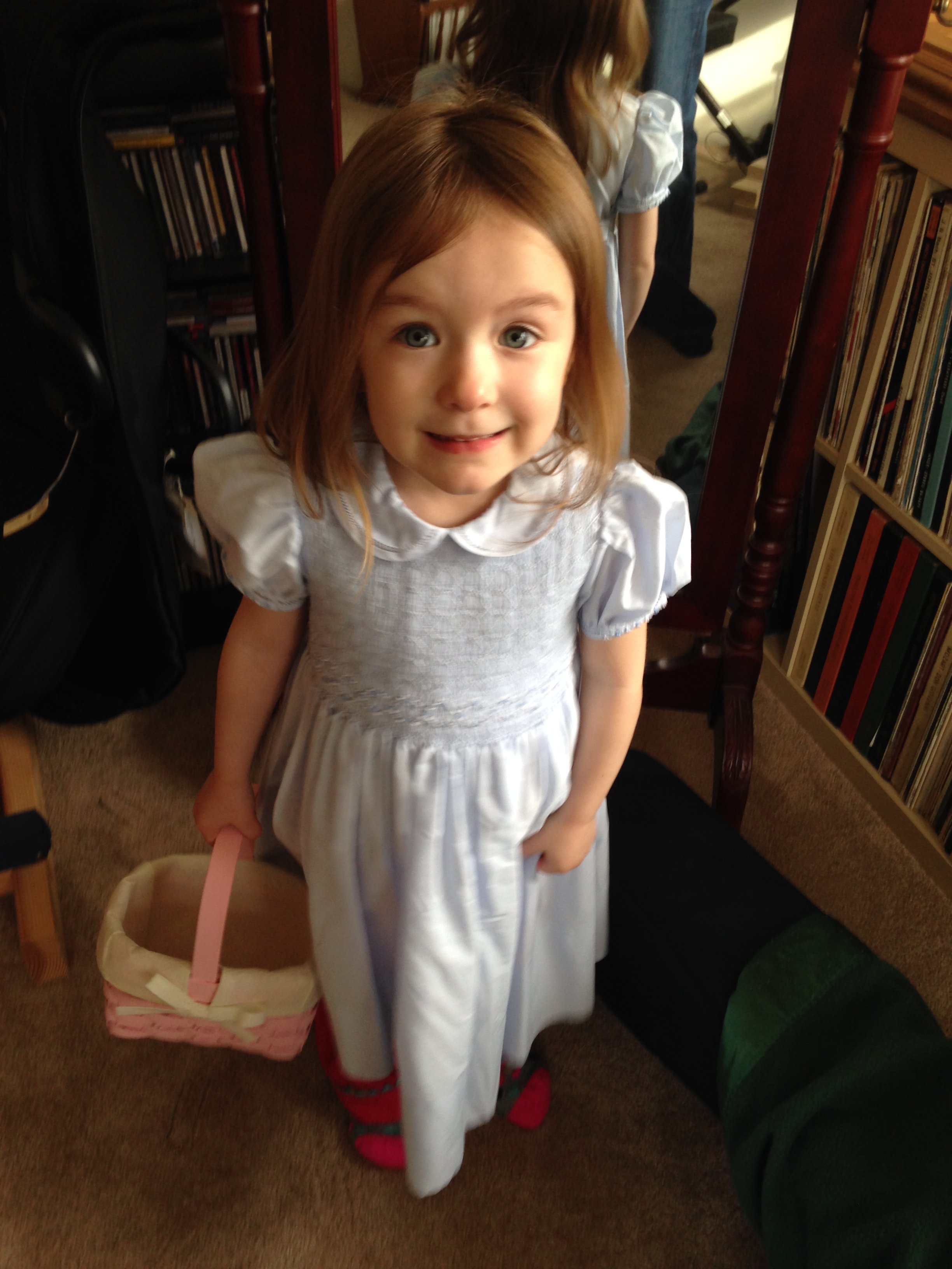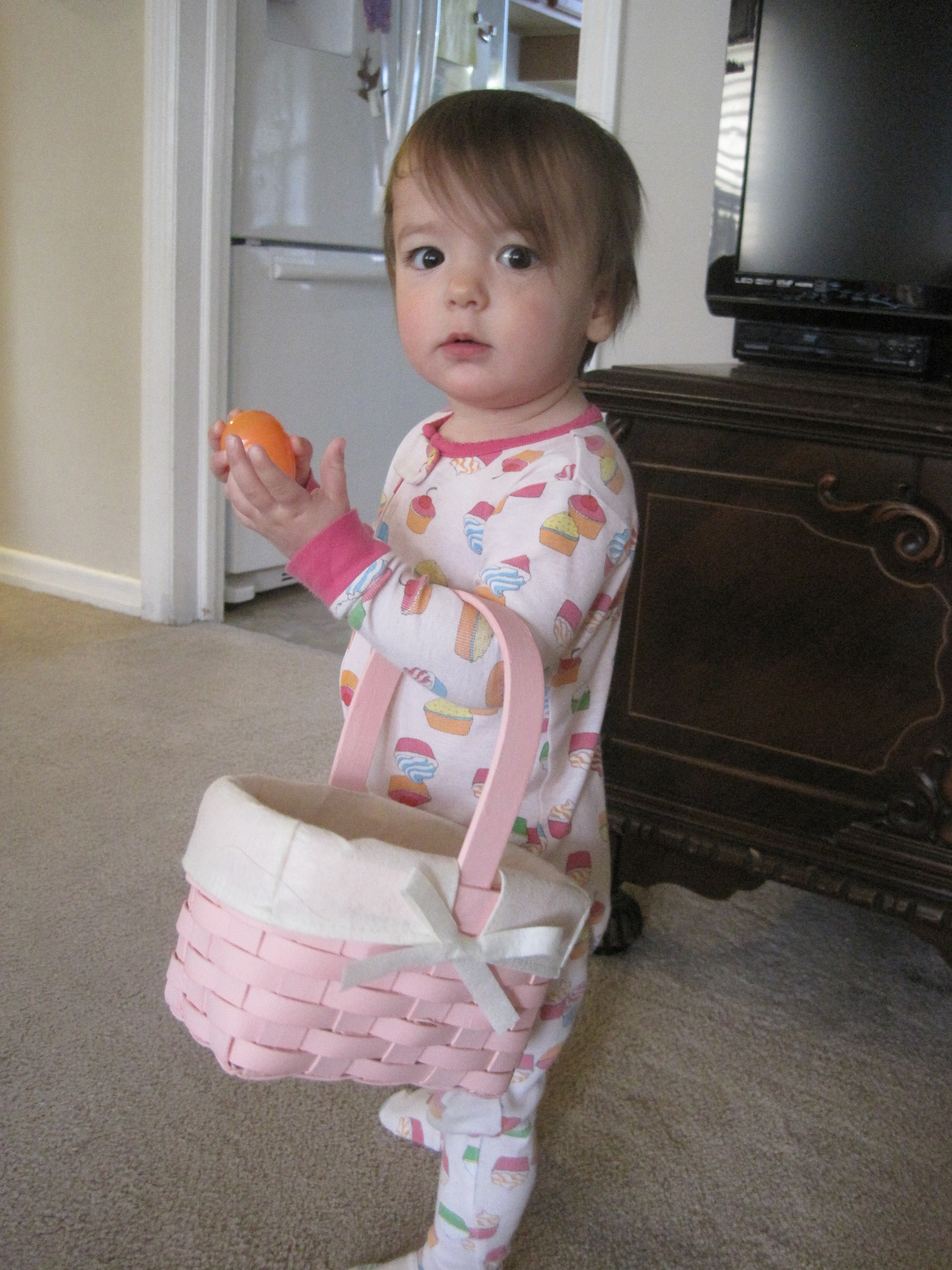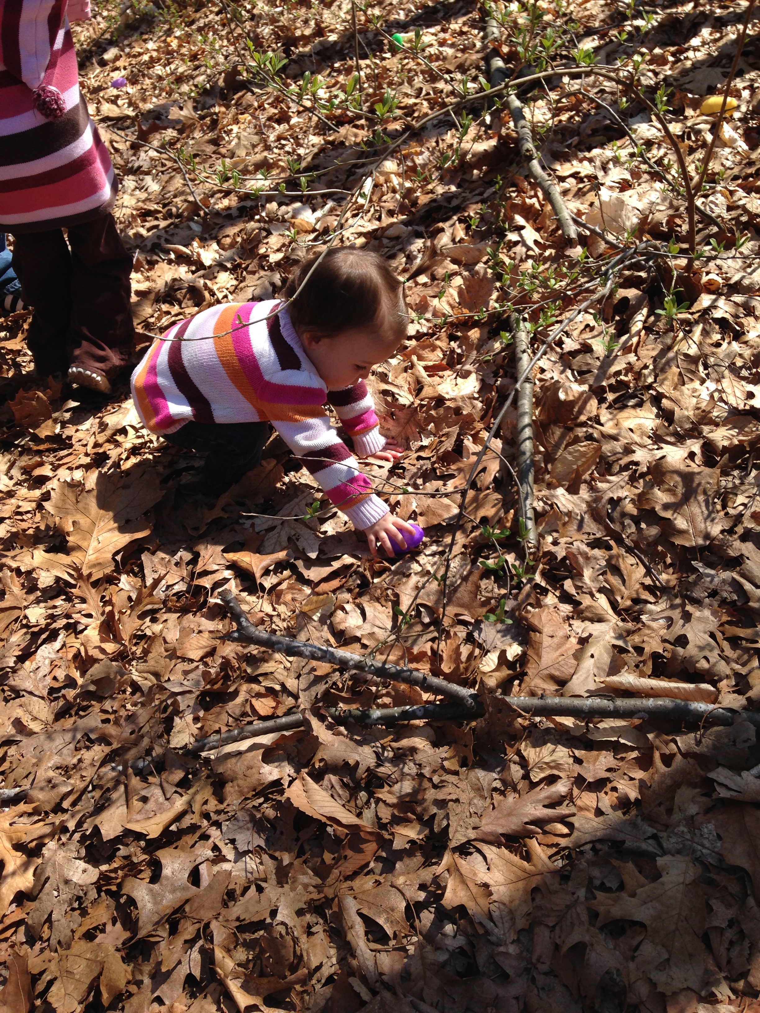 And following my late post for S’s 15 month birthday, here’s a super late post from Easter! Just like last year, we colored eggs! Last year we also did our first egg “hunt” at a local high school. This year I wanted something that required a little more actual hunting for eggs. I saw a blog post from some local moms that had a very nice summary of ideas and chose one that was close to home and sounded really fun. It was at a park and kids were led along a wooded trail and found eggs, some with candy and some pretend bird eggs. At the end the kids had to figure out which bird eggs went in which nest. M loved it and they had a great playground to explore when we were done. Even S loved it! She would have picked eggs up all day. On Easter morning, we did a little egg hunt in our living room and the girls opened their Easter baskets. Then we went to our Unitarian Church for their Easter music celebration (R played the cello!). We had great friends and their kids over for Easter dinner. It was a really nice family centric Easter this year.