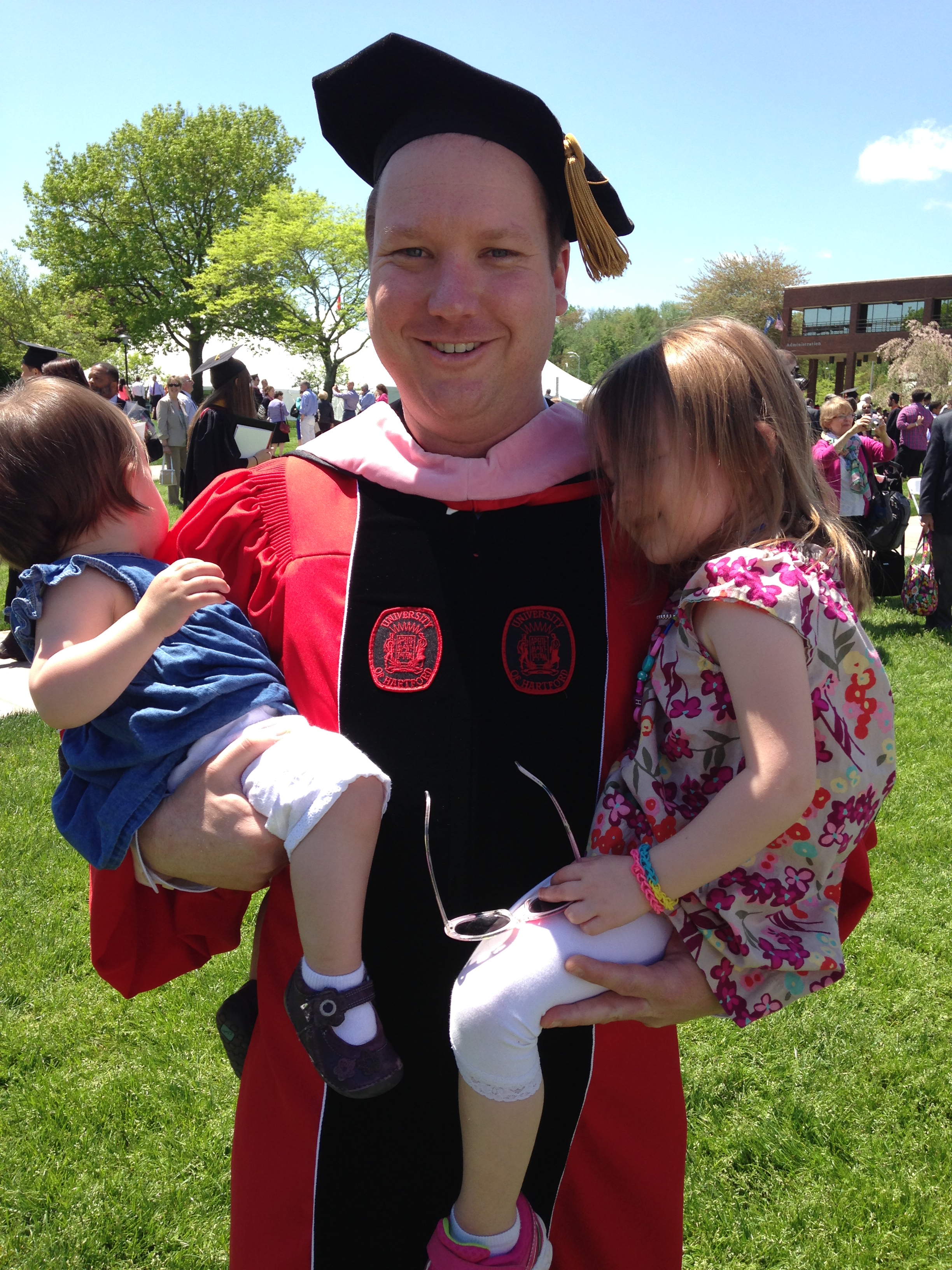 R has been working on his doctorate on and off for about ten years and I’m so proud to say that he’s finally completed it! When he started we weren’t married, didn’t own a house, didn’t have a dog, didn’t have M, he wasn’t working full time, we didn’t have S . . . he’s continued to work hard on his degree through many changes in our life together. I can’t even begin to say how happy I am for him and how proud I am of him. He completed his thesis around Christmas time and ended up having his diploma dated for the end of January, but it was so nice to have closure and get to celebrate as he walked across that stage yesterday. Then we celebrated with our friends and family! His brothers and mom and dad were all here, along with two aunts, an uncle and a cousin. My cousin came from Boston and lots of friends were here to celebrate too! We had a backyard fish fry, of which I took absolutely no photos! What a great day! Congrats baby – you earned this and we are all so proud of you!