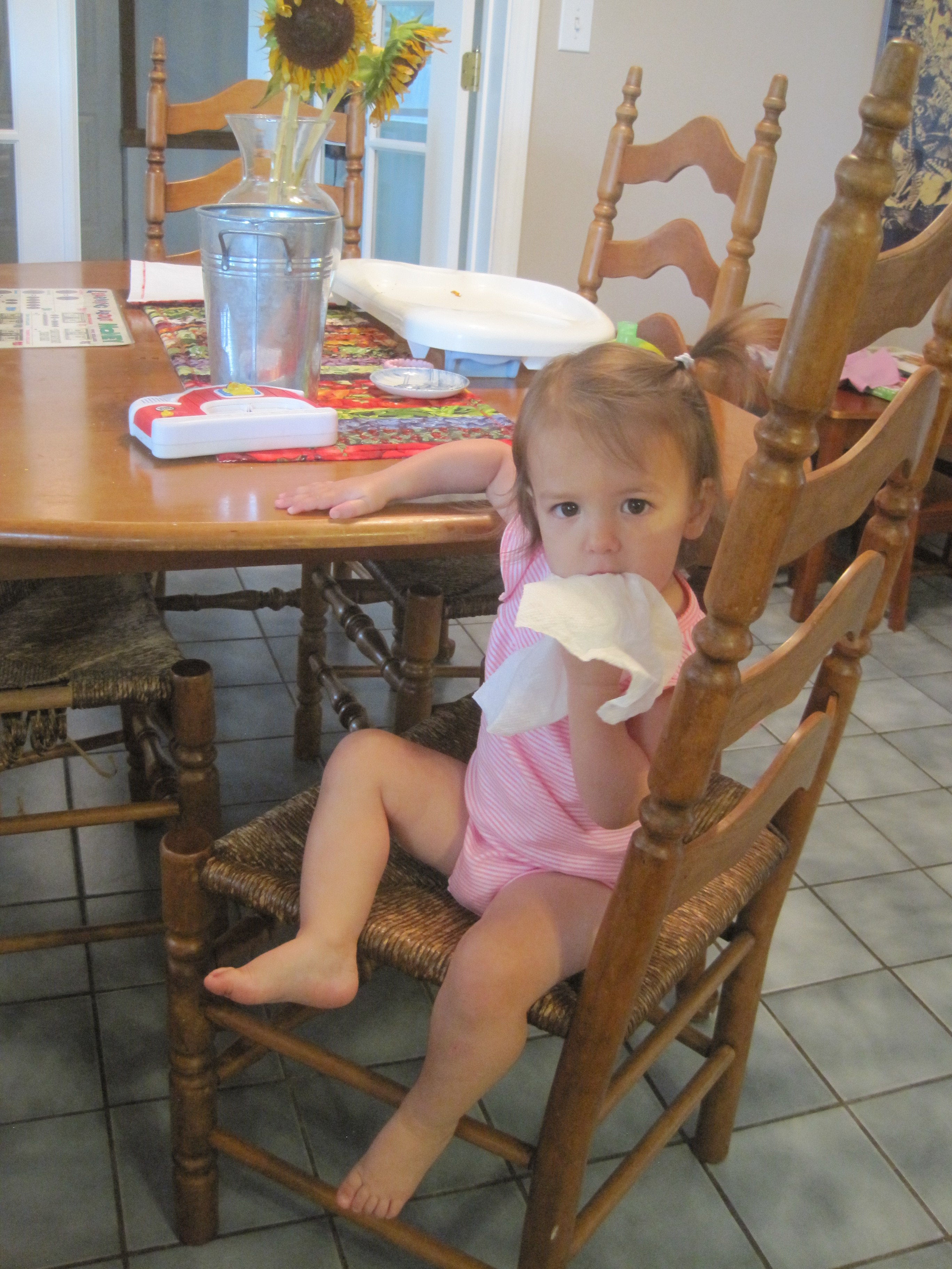 Here’s our little climber after getting herself up on the chair to reach a paper towel on the table.