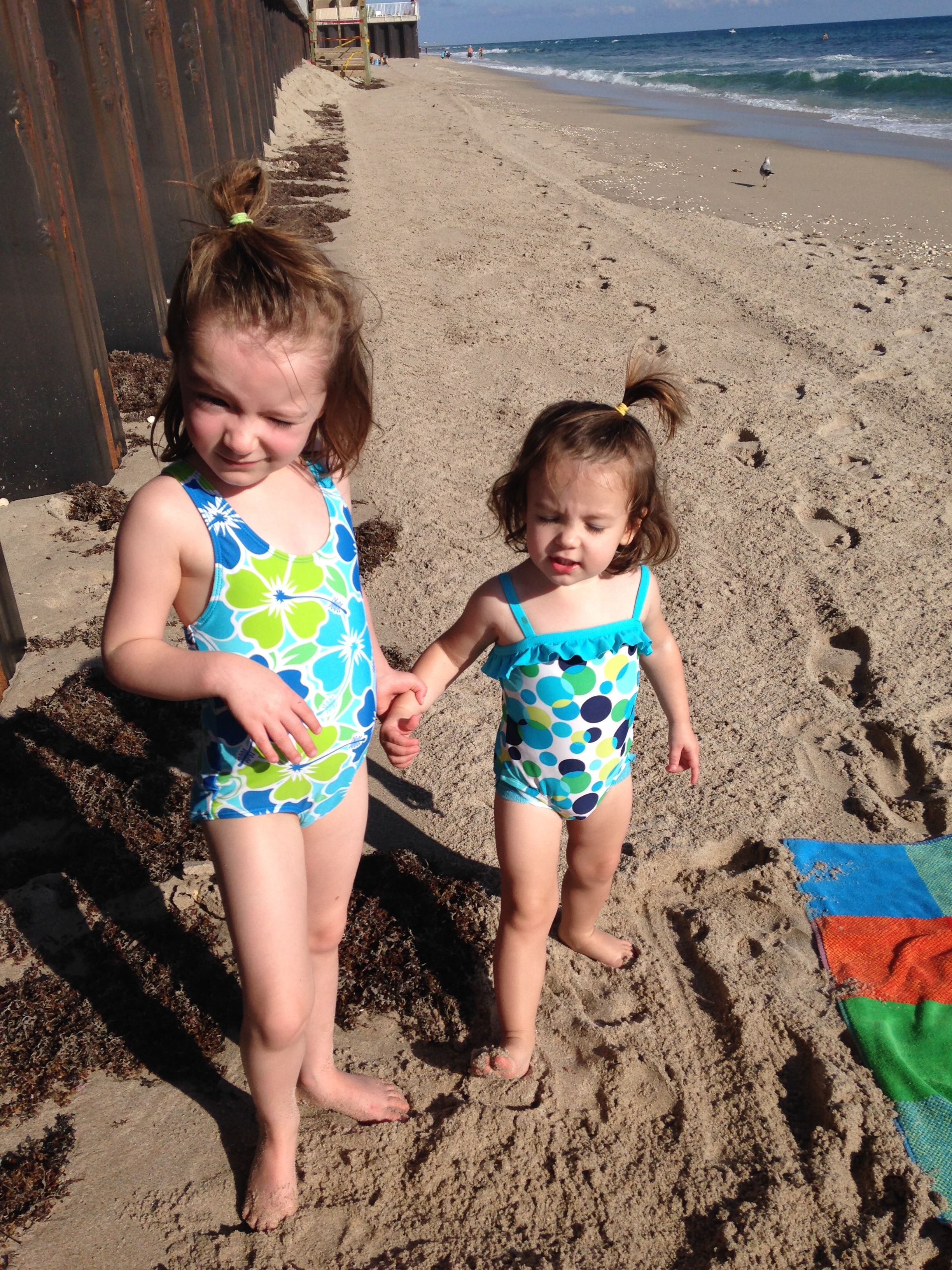 We had a really fun trip to Florida for Christmas! M was a total champ while traveling. She walked with her violin on her back and pulling her small carry on rolling suitcase. We had a good time on the plane for the most part, eating treats most of the way. I had to work a few days of our week stay, but we were still able to make it to the beach and see all of our family. R got the girls to the zoo with his mom, our niece and one of his childhood friends and her family. We had four Christmas celebrations in Florida, in addition to the one we had here before we left. We have way more stuff than we need, but we are so thankful for thoughtful family. The girls had mixed feelings about the beach. M had to be bribed with donuts to go anywhere near the sand and refused to go near the water because of the jellyfish. We could hardly keep S from running head first into the strong tide. We didn’t stay long. This year, M asked Santa for a doll with hair she can brush, but changed her mind after Santa had already done his shopping and asked for a pony with her she could brush. She was lucky he was able to pull off both. She has yet to brush anyone’s hair. S “asked” for a baby doll, as her sister has several and doesn’t really love to share, even though she doesn’t really play with them. S loves her new baby doll and putting the binky back it’s mouth 85 times a day. We were lucky enough to meet up with a few old friends – one with a new baby, one about to embark on a cross country move with her little family, one from the military and a few WPB hold outs. Here are a few photos from our trip.